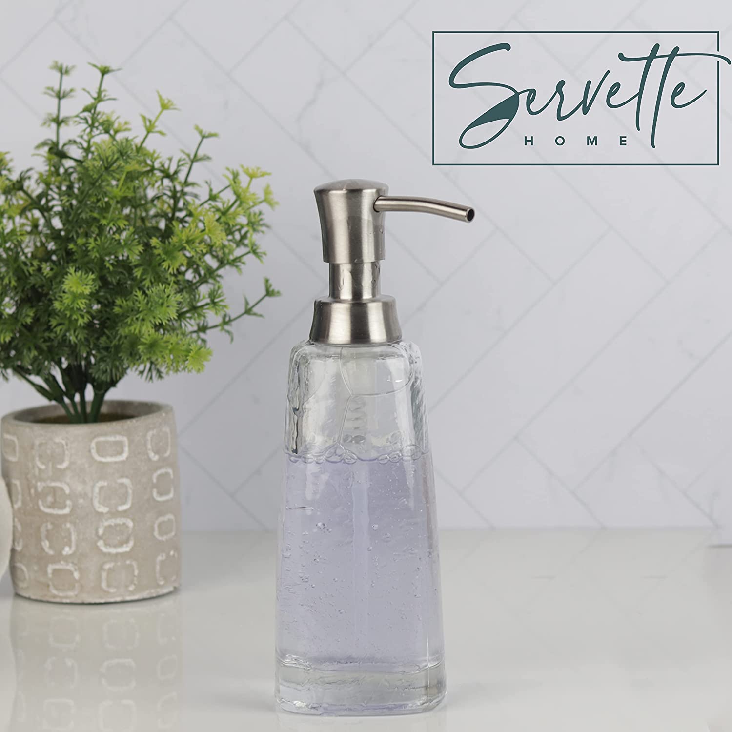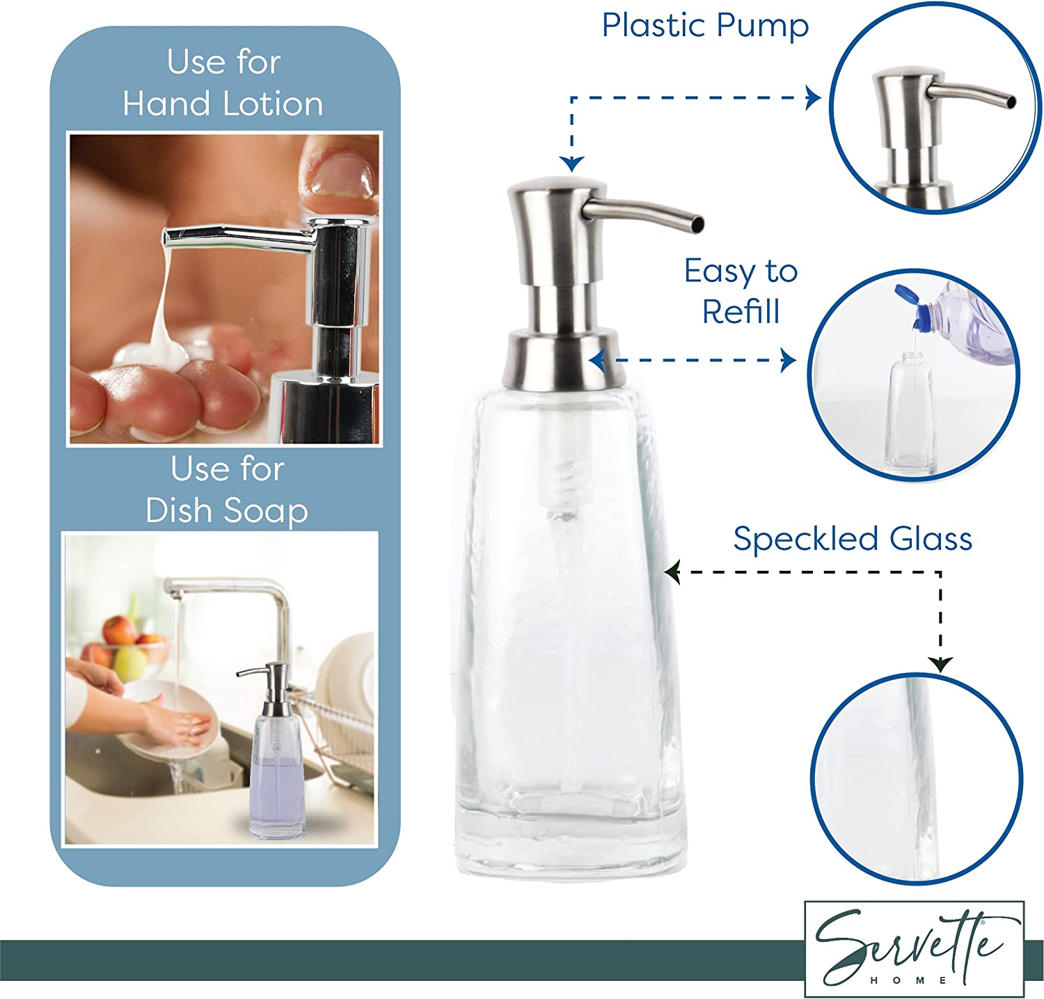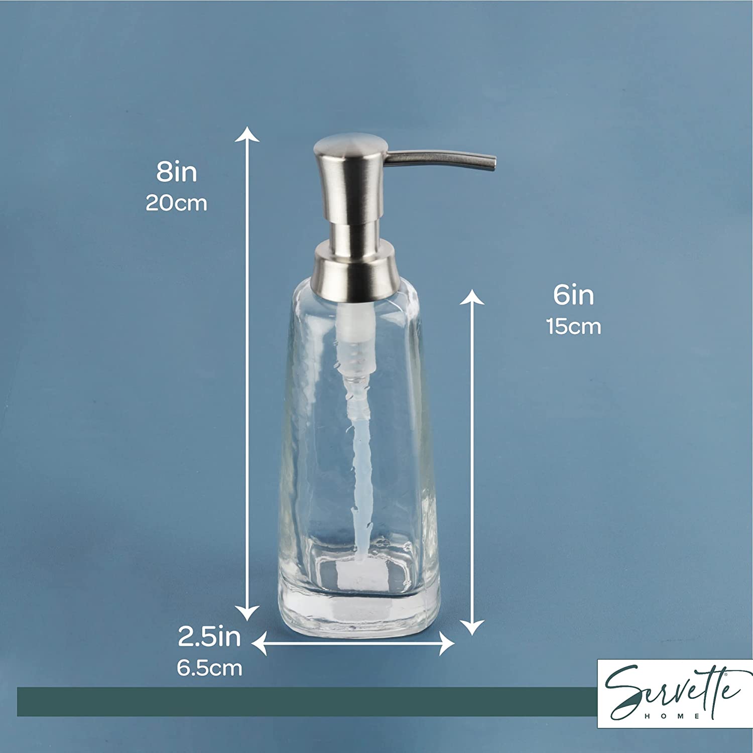 This clear glass hand soap dispenser is the perfect choice for kitchen organization and bathroom organization. Add a touch of sleek kitchen décor with this dispenser for your kitchen sink.: This glass soap pump by Servette Home makes the perfect gift for any loved one on their birthday, anniversary, Valentine’s Day and other occasions.: The liquid soap holder is a tall dimpled soap dispenser with a plastic lid and glass base. The unique design is a tall shape which gets narrower as it goes up.: The liquid soap holder has a plastic screw on top which can be easily filled with your favorite liquid soap, or hand lotion.: The dish soap dispenser measures 8”H X 2.5” W See images for exact measurements.