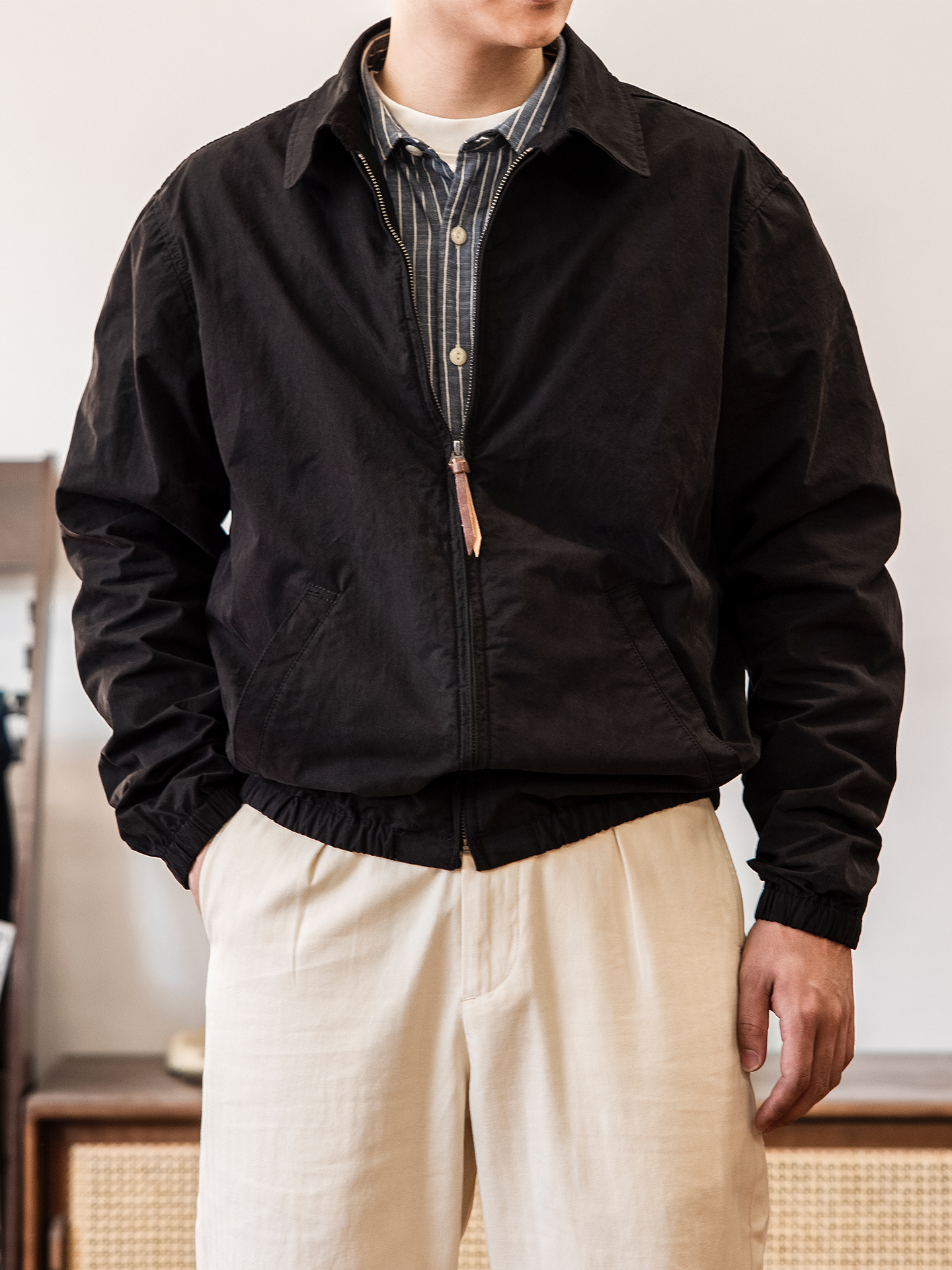 Full-zip front with a leather puller