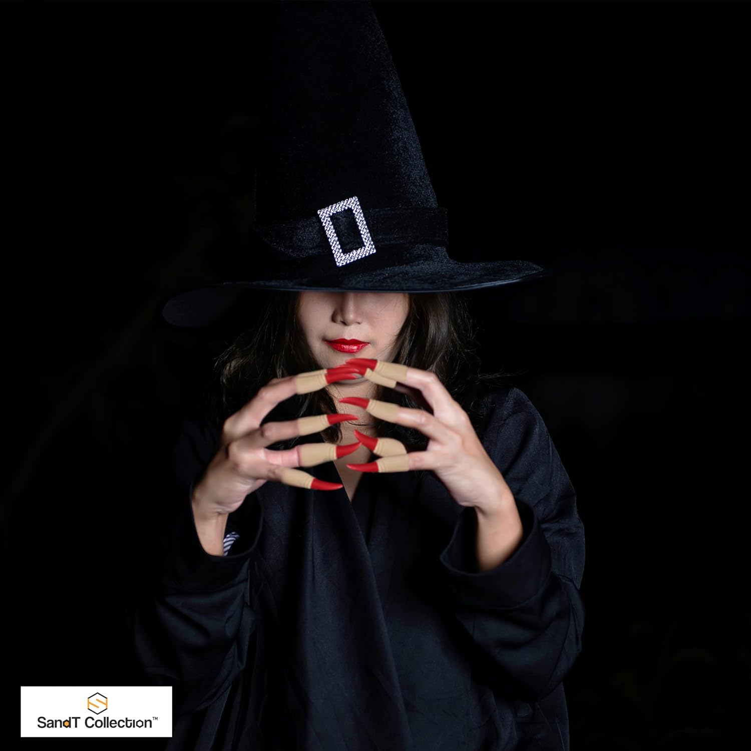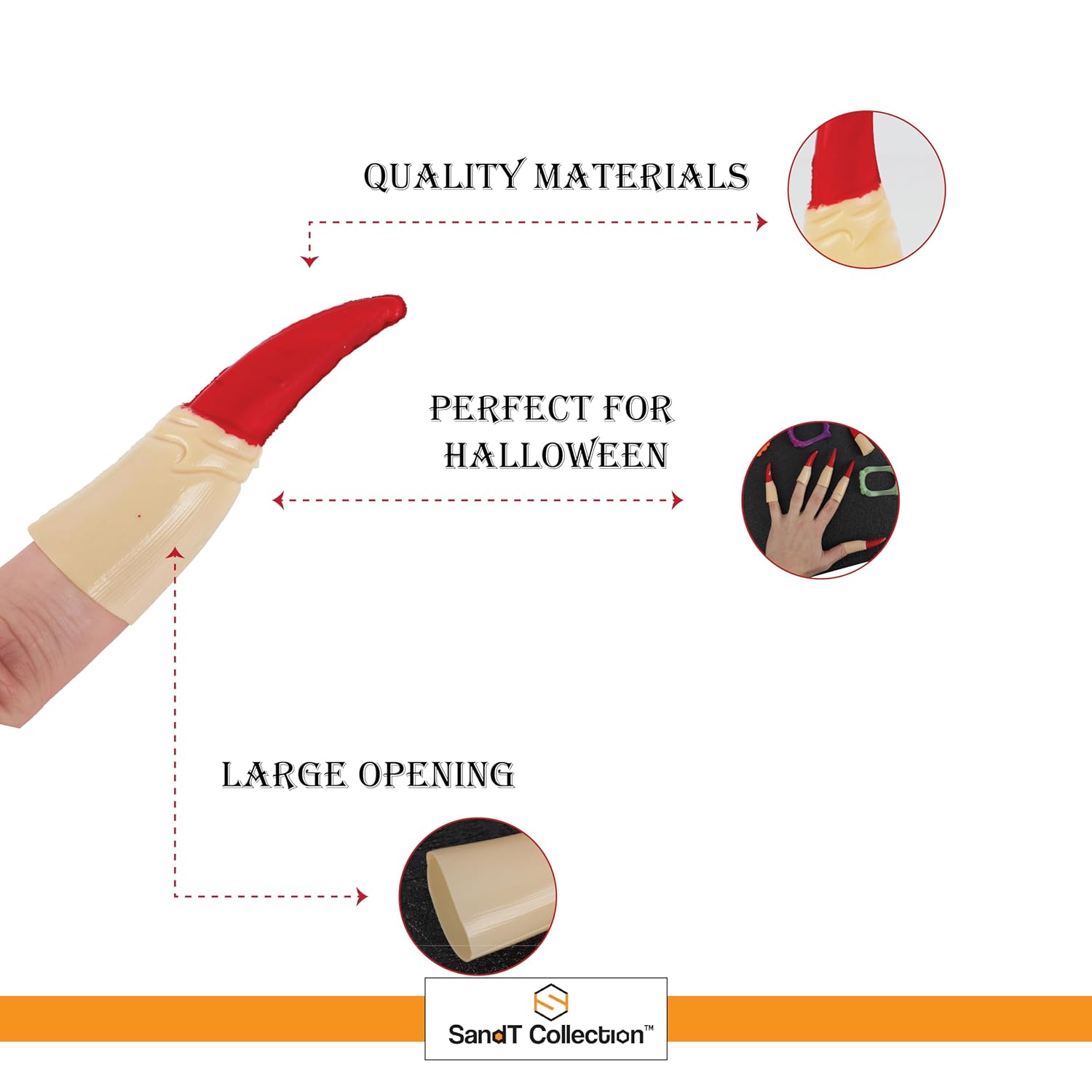 Get just a bit creepier this Halloween with SandT Collection's set of 10 finger tips with bright red nails. Slip on these finger nails for fake nails perfect for a witch, vampire, or zombie costume. Easy to slip on and off so you can wear and remove as desired. Each tip measures 2.5 x .75 inches. Fits adult men and women.
