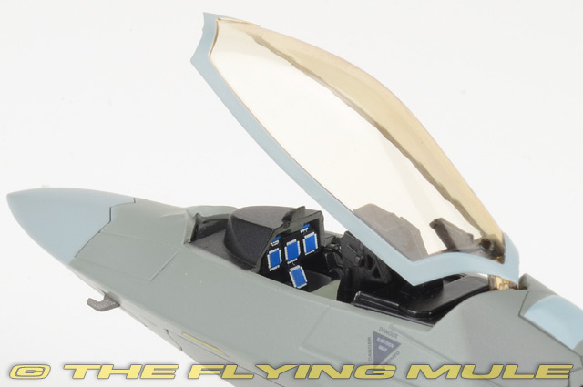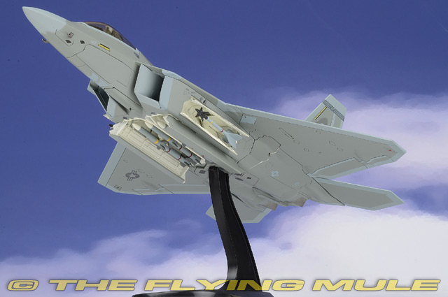 In 2013, F-22A #07-4147 became 477th Fighter Group's flagship with the words "Spirit of Tuskegee" painted across the tail, a nod to the units Tuskegee Airmen heritage. "We are part of history. Whether we realize it or not, what we do on a day to day basis is writing the pages of history," said, Col. Tyler Otten, 477th Fighter Group commander, who was the first pilot to fly the group's flagship after the paint job. "Maintaining our connection to our lineage provides a foundation on which we build. The Tuskegee heritage of the 477th is rich with courage, service and commitment, which serves as a guide to our efforts today." The 477th Fighter Group was previously the 477th Bombardment Group, a Tuskegee unit activated in 1944. The group's 302nd Fighter Squadron historically was part of the 332nd Fighter Group, also known as "The Redtails" the famous all-black unit that fought both American prejudice and the axis powers in Europe. Lockheed F-22A RaptorDesigned to meet a US Air Force requirement for an Advanced Tactical Fighter (ATF) to replace the F-15 Eagle, the F-22 was first flown on September 29th, 1990. The USAF's ATF program aimed to produce a fifth-generation air superiority fighter that would be better matched against emerging new aircraft such as the Su-27 Flanker. The F-22 uses stealth technology and can function in air superiority, ground attack, intelligence and electronic warfare roles. Despite its capabilities, the F-22 program was relatively short-lived; by 2010 its high cost coupled with the development of the F-35 (a more versatile and less expensive aircraft) led to a cessation of F-22 production funding.© Copyright 2003-2026 The Flying Mule, Inc. Hobby Master's 1:72 scale F-22 Raptor is constructed almost entirely in diecast metal with near-seamless construction. The cockpit has an articulating hinged smoke-colored canopy that closes with almost no visible gap and opens to reveal a detailed interior with side-mounted fly-by-wire joystick, throttle controls, ejection seat and pad-printed digital display screens. The stabilators are movable, and the under-wing mounted fuel tanks are removable. The landing gear are constructed as complete subassemblies for quick configuration, and a full complement of configurable ordnance exposes structural details when configured in the deployed position. © Copyright 2003-2026 The Flying Mule, Inc. Hobby Master 1:72 Air Power SeriesThe Hobby Master "1:72 Air Power Series" range presents detailed, ready-made diecast models of military aircraft.Hobby Master "1:72 Air Power Series" diecast airplanes feature: