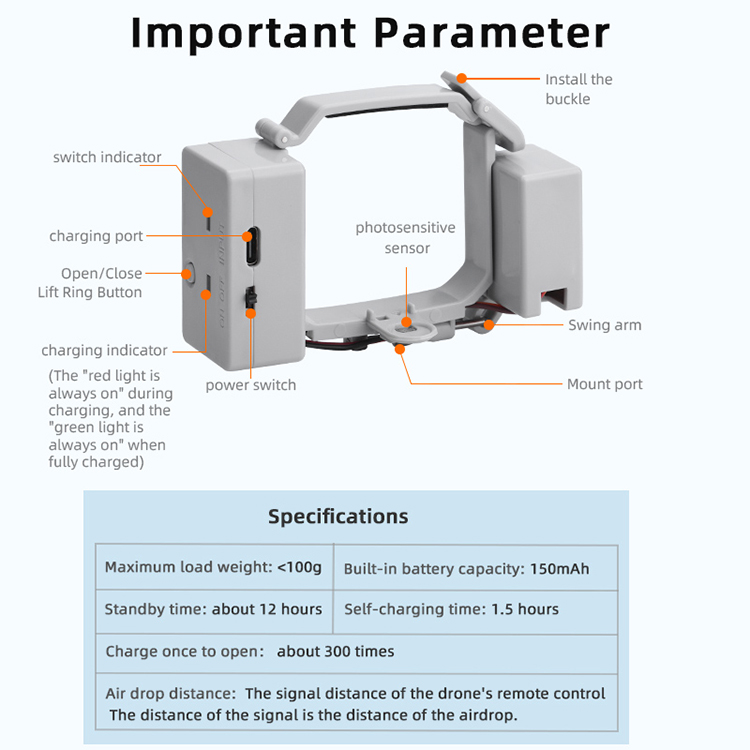 l Lightweight and safe, neither increase the burden of the drone nor damage the drone, easy to install and remove