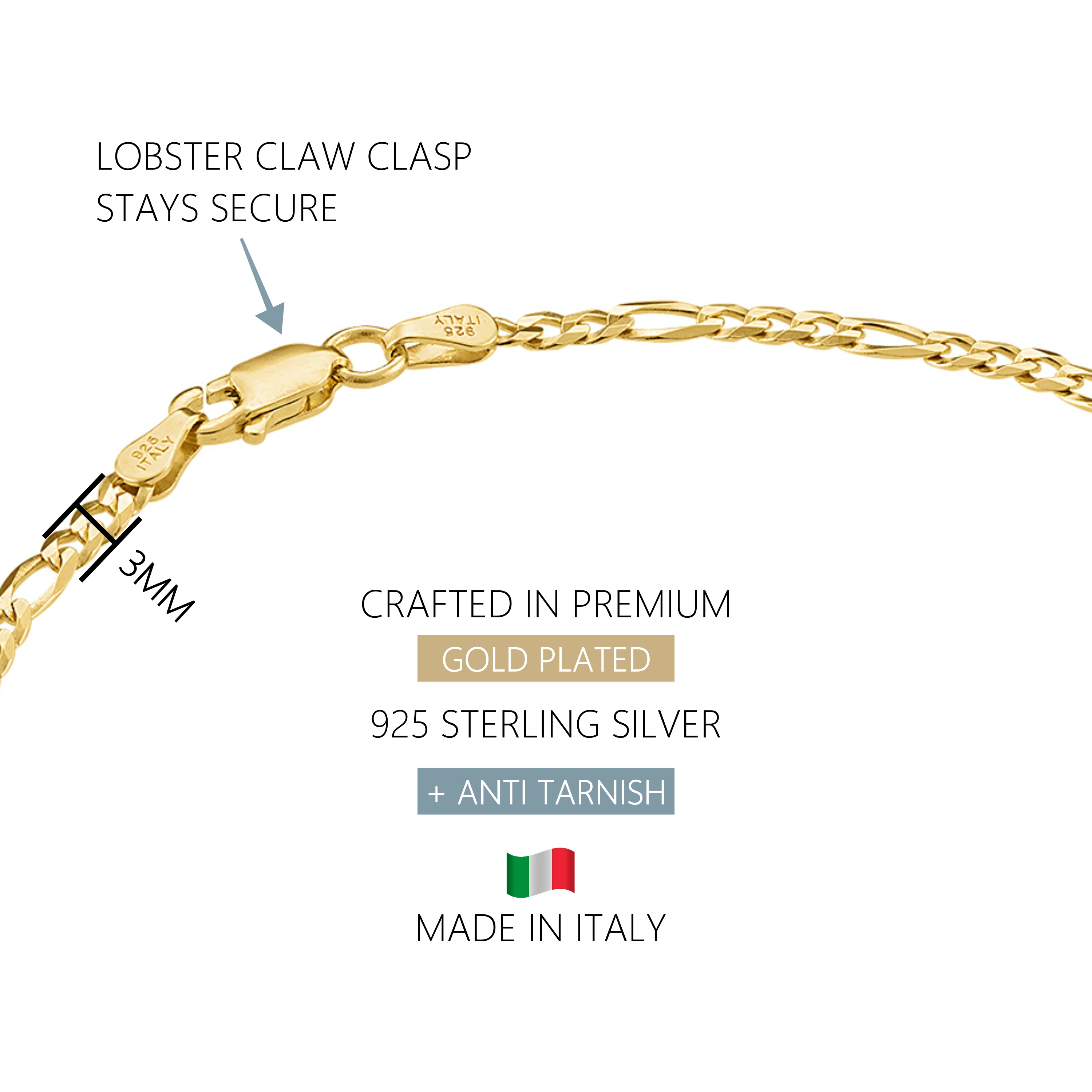 Elevate your style effortlessly with the KISPER 18K Gold Over 925 Sterling Silver Italian 3mm Solid Diamond-Cut Flat Figaro Link Chain Anklet Ankle Bracelet for Women, meticulously crafted in Italy. This versatile accessory seamlessly transitions between various occasions and styles, whether you're aiming for casual chic with denim or adding a touch of glamour to a flowy summer dress. Perfect for beach outings, its radiant design enhances barefoot strolls in the sand, while it also makes a statement peeking out from under evening attire for more formal occasions. Crafted from 92.5% pure sterling silver, its thin figaro link chain is nickel-free and hypoallergenic, making it ideal for sensitive skin. With a thick layer of 1 micron 18K yellow gold plating for added durability, this anklet is both luxurious and resilient. Packaged in a Kisper jewelry pouch, it's the ideal gift for wives, daughters, mothers, sisters, girlfriends, or best friends, suitable for anniversaries, birthdays, holidays, and special occasions. Backed by a lifetime guarantee, this anklet ensures both style and peace of mind.