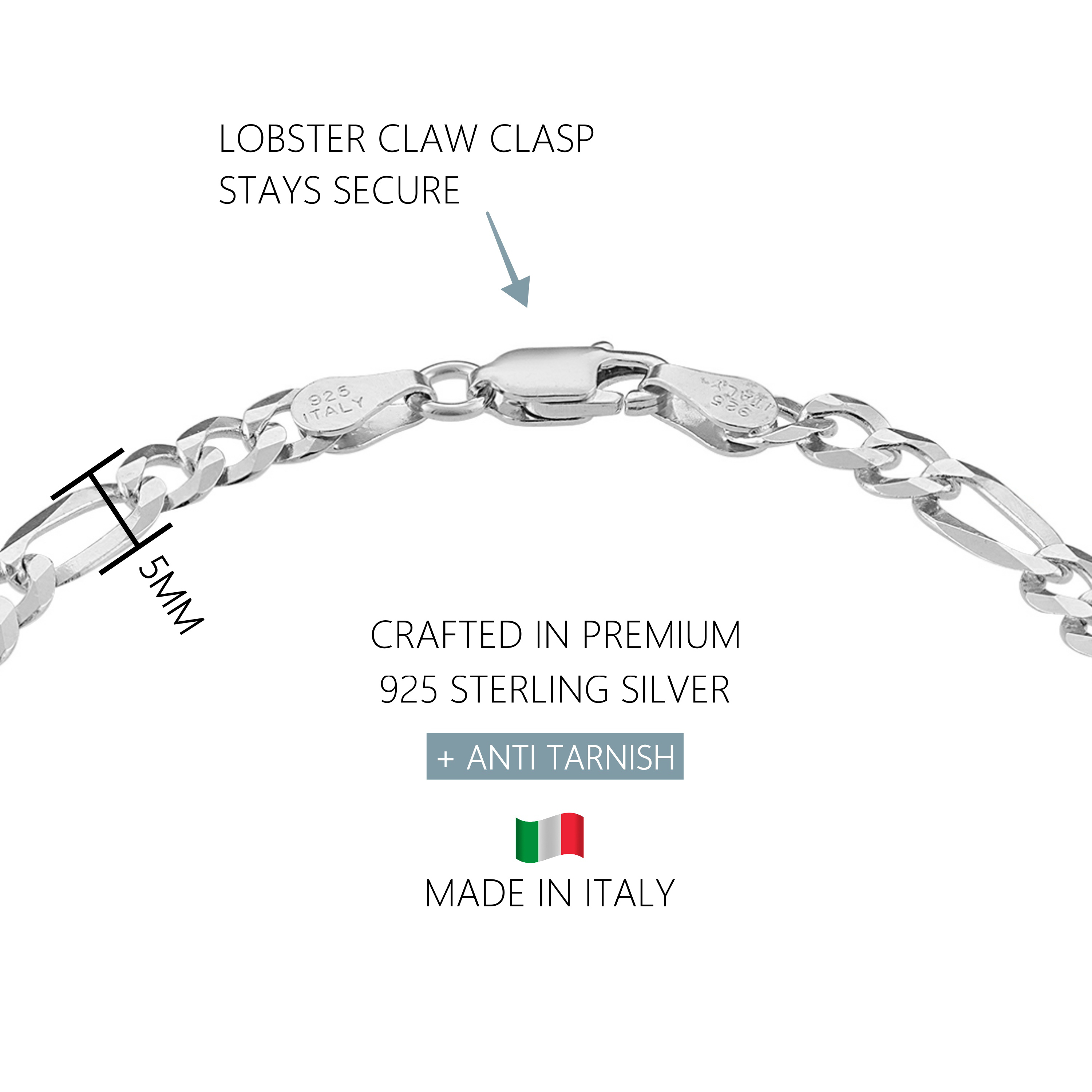 Introducing the KISPER Solid 925 Sterling Silver Italian 5mm Diamond-Cut Figaro Link Chain Bracelet, a timeless addition to your accessory collection for both men and women. Elevate your style effortlessly with this solid sterling silver bracelet featuring flat diamond-cut links that offer a rich shine, adding a modern edge to any outfit. Slim yet durable at 5mm, it's designed for daily wear, whether worn alone for a polished look or stacked for a trendy fashion statement. Crafted from 92.5% pure sterling silver, this figaro link chain is nickel-free and hypoallergenic, making it suitable for sensitive skin. Treated with an anti-tarnish finish for added durability, it ensures long-lasting beauty. Available in various lengths, each bracelet is equipped with a secure lobster-claw clasp and spring mechanism. Made in Italy with superior craftsmanship and design excellence, it embodies the rich heritage and passion of Italian jewelry. Packaged in a Kisper jewelry pouch, it's the perfect gift for any occasion, backed by a lifetime guarantee, ensuring comfort and style for everyday wear.