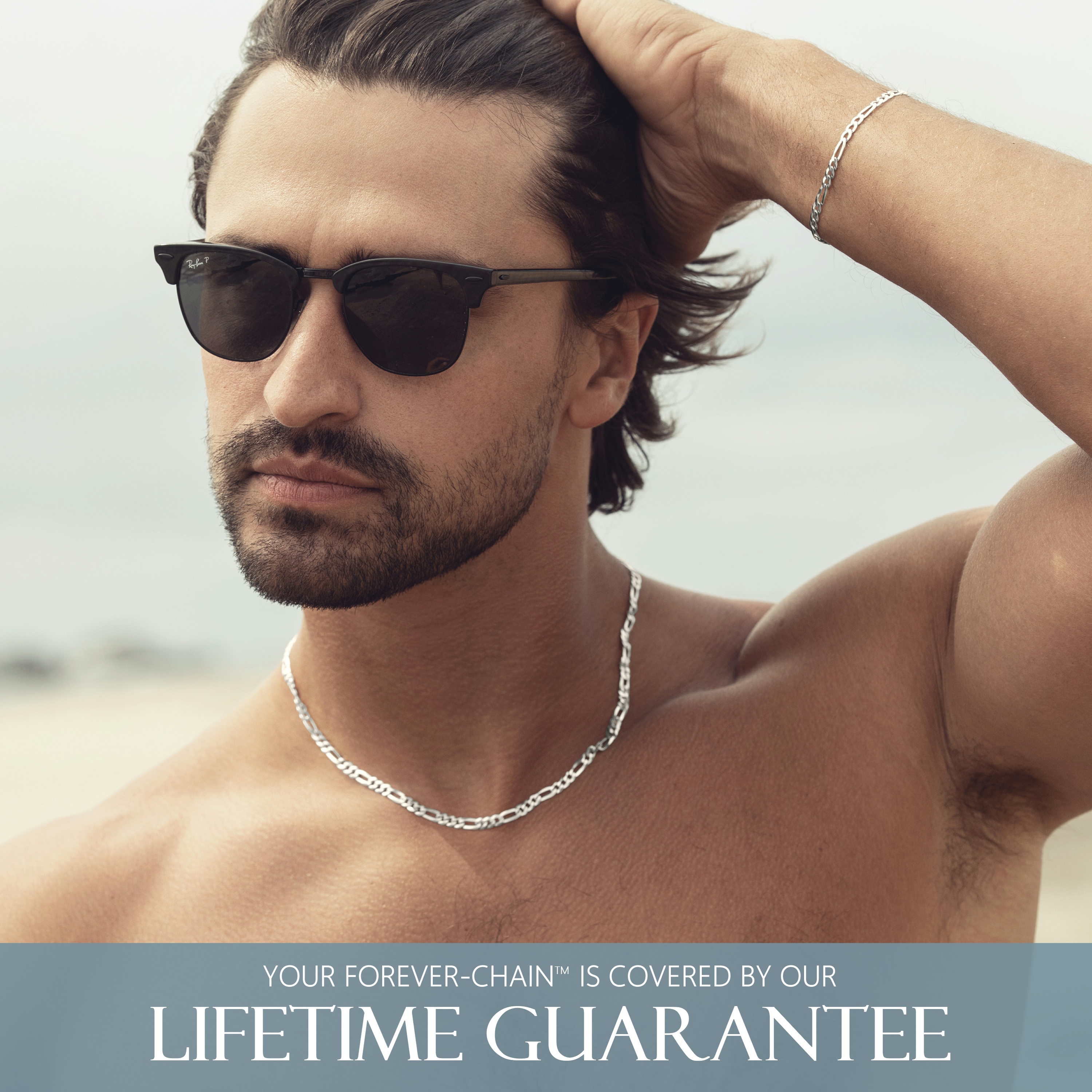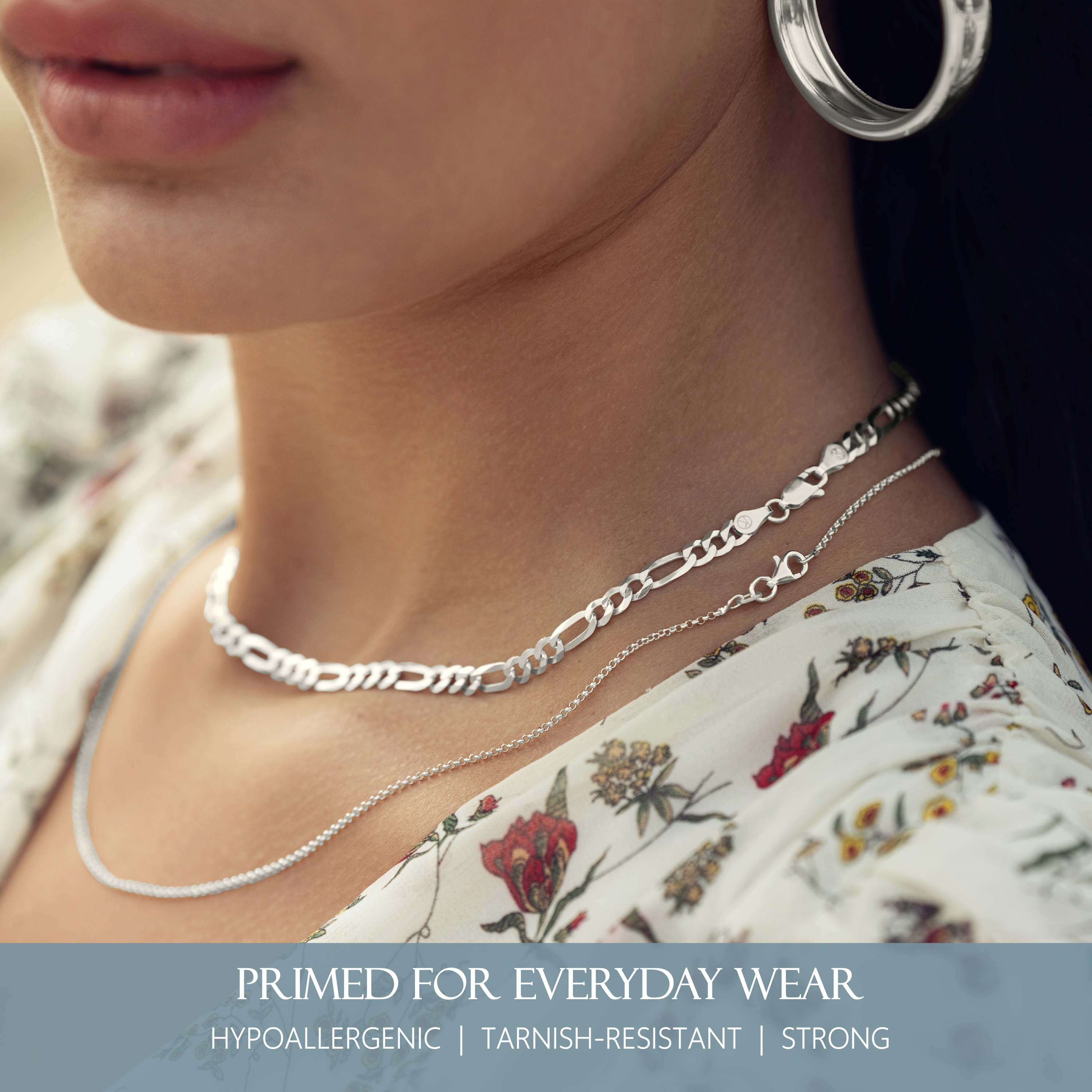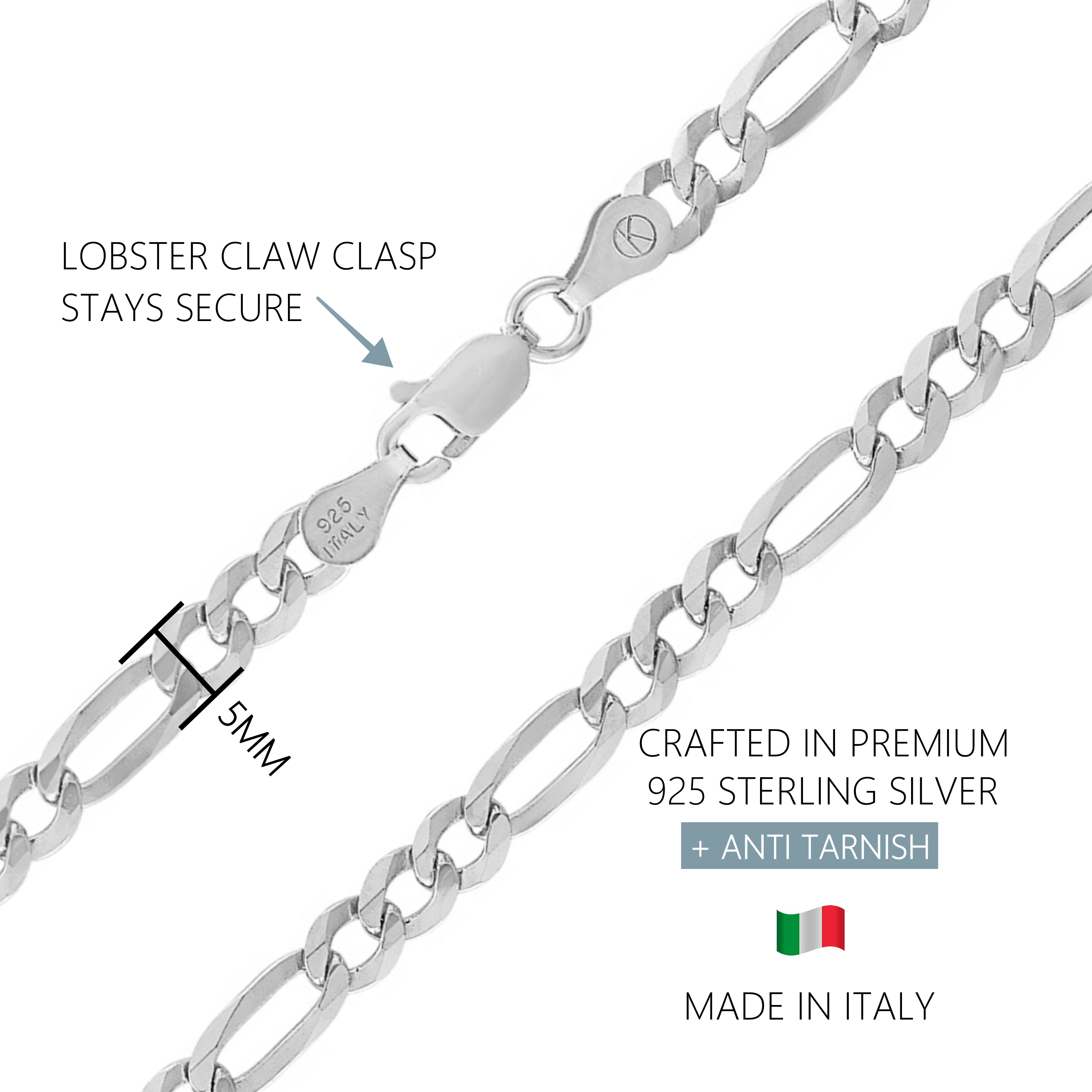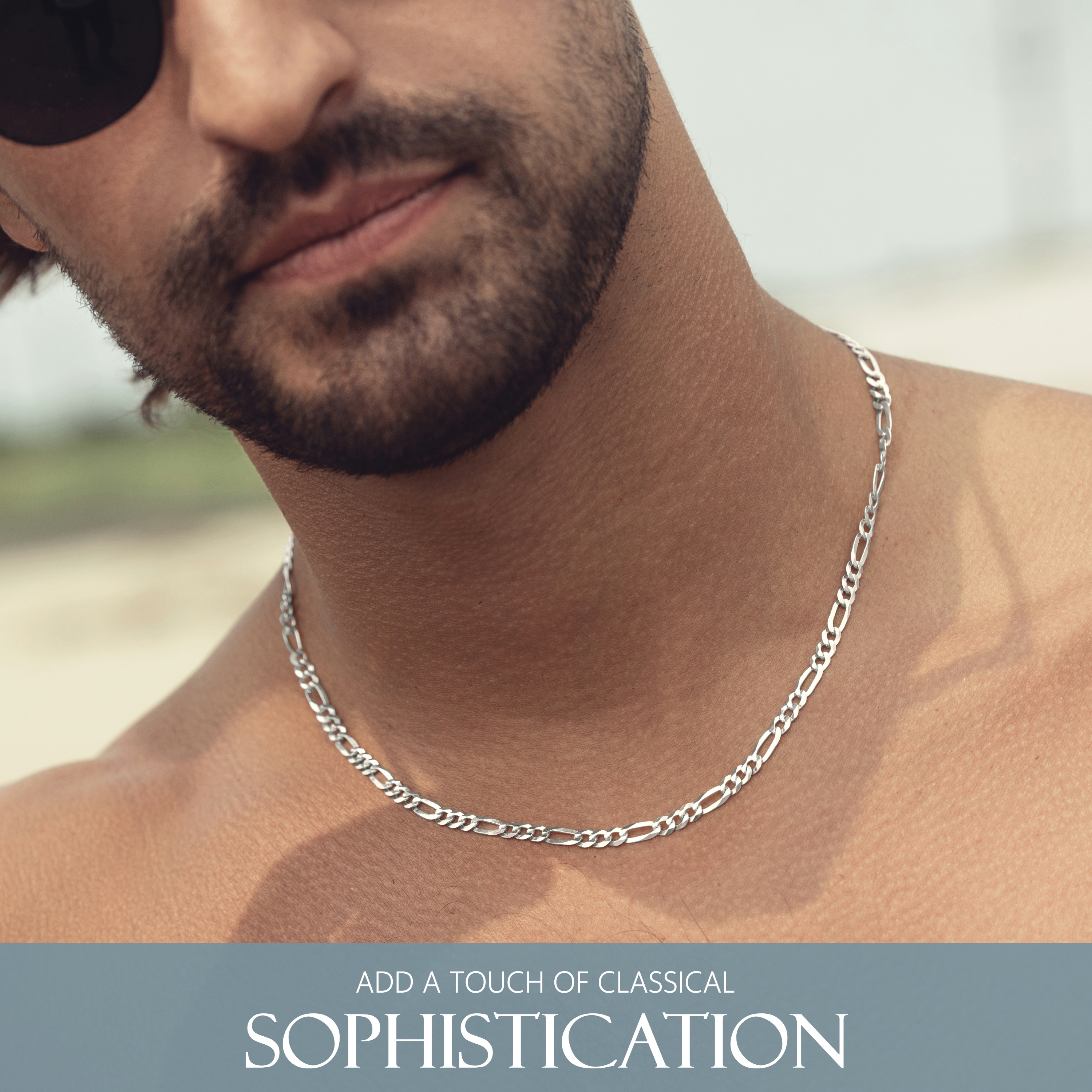 Introducing the KISPER Italian 925 Sterling Silver Diamond Cut 5mm Figaro Link Chain Necklace, a sophisticated accessory designed for both men and women. Crafted from the finest solid 925 sterling silver with impeccable craftsmanship, each piece is stamped for authenticity, ensuring quality you can trust. The necklace features a flat Figaro link chain with a diamond-cut design, adding sparkle and elegance to any ensemble. Lightweight yet durable, it's perfect for everyday wear. The secure lobster clasp ensures easy and safe fastening, while the versatile style allows it to be worn for various occasions, from formal events to casual outings. Available in different lengths ranging from 16 inches to 30 inches, you can choose the perfect length to complement your style and preference.