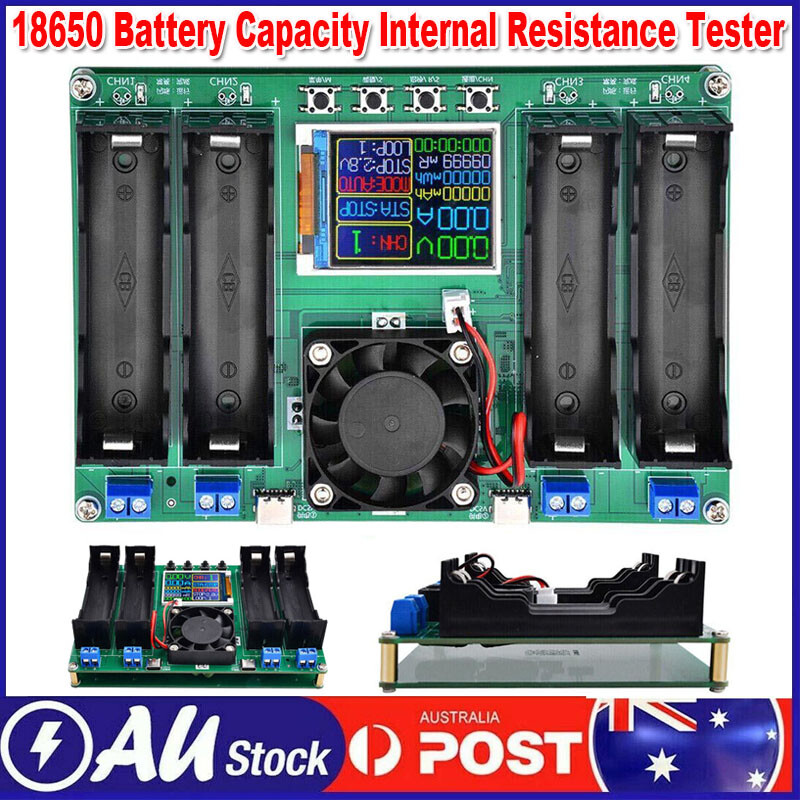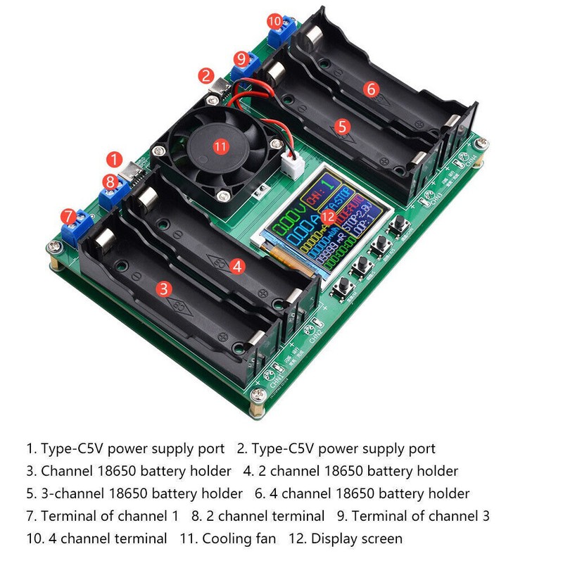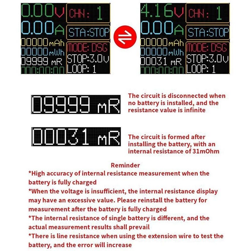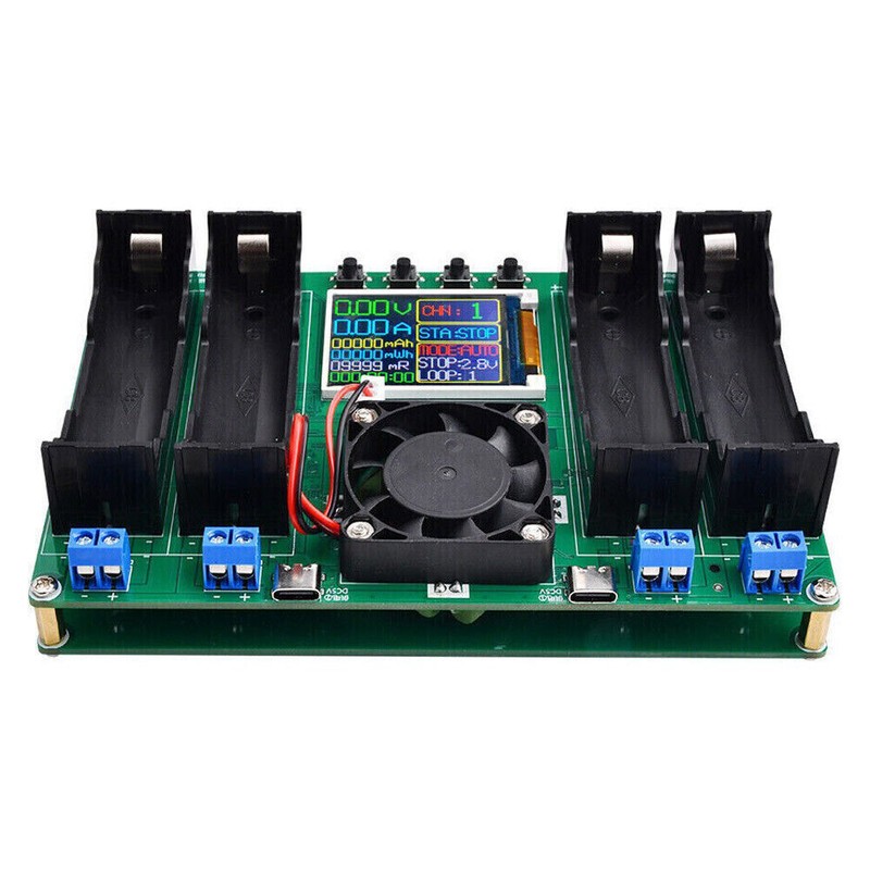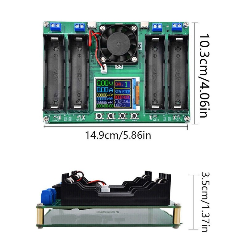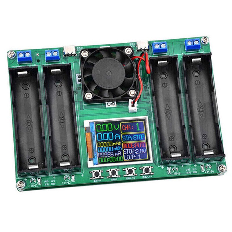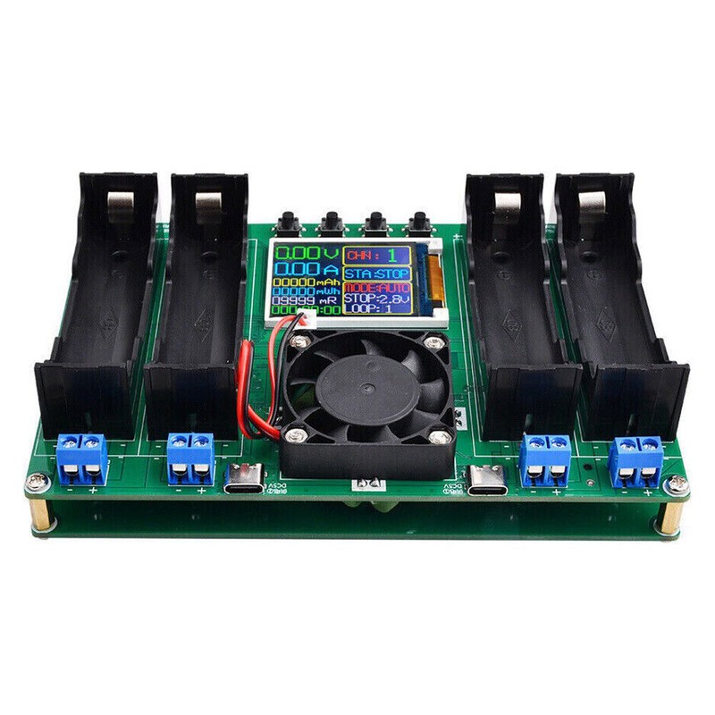 Features: Supports four-channel capacity and internal resistance measurement Supports separate charging and discharging, and up to 9 charging and discharging cycles in automatic mode Each channel is independent of the other and can be set up separately for independent operation without interference The 18650 battery holder is a compact battery holder for flat battery measurements Active fan cooling with overheating protection DC two-wire method for internal resistance testing Note: Does not support charging of lithium iron phosphate batteries