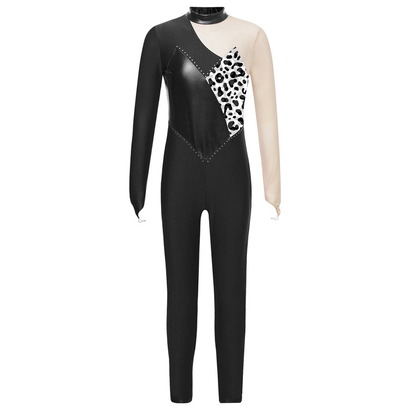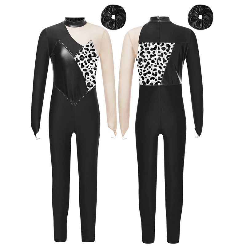 Full length figure skating jumpsuit ensures total movement and flexibility when leaping or tumbling. Come with a hair tie.
