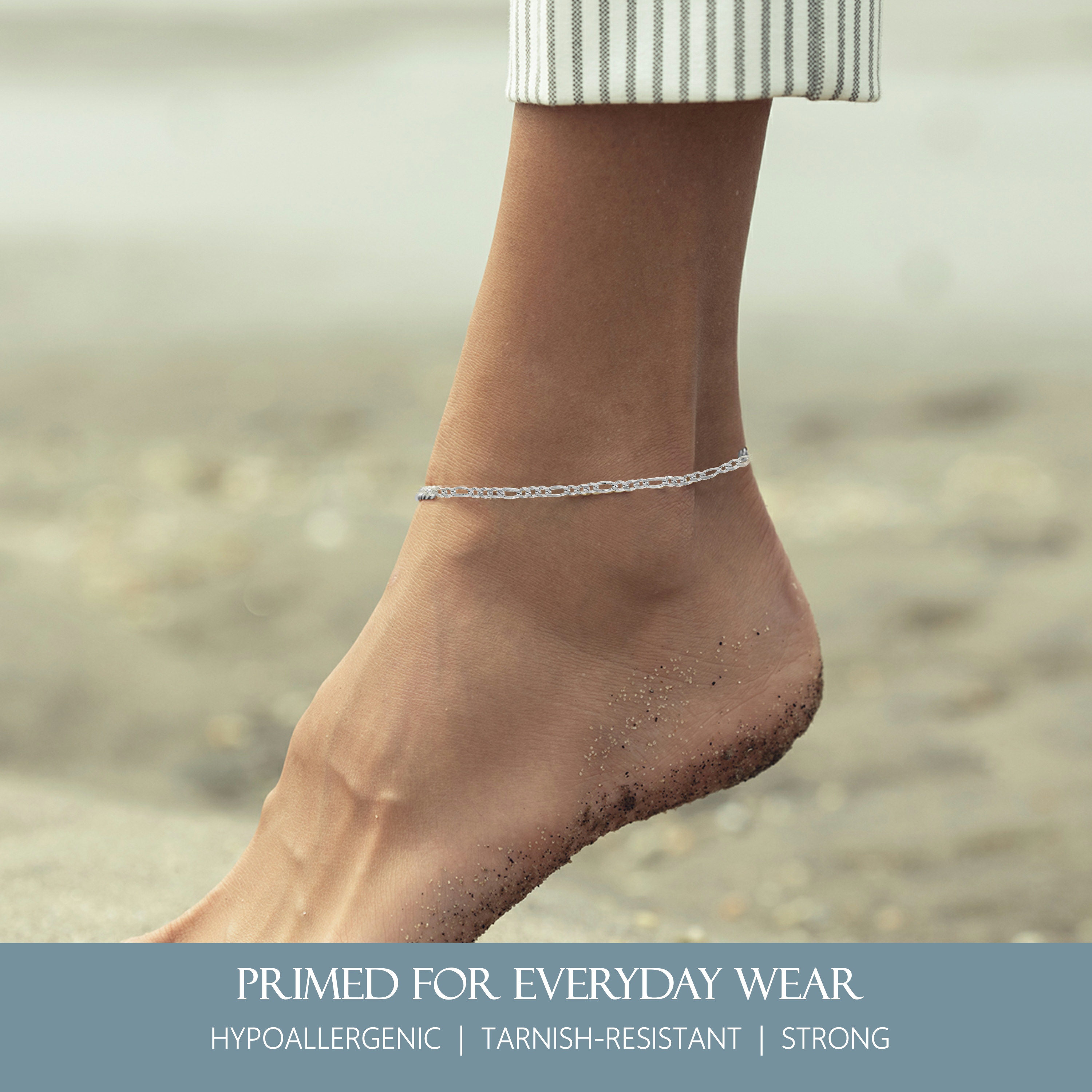 Introducing the KISPER Solid 925 Sterling Silver Italian 3mm Diamond-Cut Flat Figaro Link Chain Anklet Ankle Bracelet for Women, a versatile accessory designed to elevate your style effortlessly. Crafted from 92.5% pure sterling silver, this anklet features a thin figaro link chain that adds a touch of glamour to any outfit. Whether paired with denim for a casual chic look, or worn barefoot on the beach for a radiant statement, this anklet transitions seamlessly between various occasions and styles. Treated with an anti-tarnish coating for added durability, it's nickel-free and hypoallergenic, ideal for sensitive skin. Available in various lengths with a secure lobster-claw clasp and spring mechanism, this anklet combines style and functionality. Made in Italy with superior craftsmanship, it reflects the rich heritage of Italian jewelry and meets the highest government quality standards. Packaged in a Kisper jewelry pouch, it's the perfect gift for anyone, backed by a lifetime guarantee, ensuring comfort and style for everyday wear.