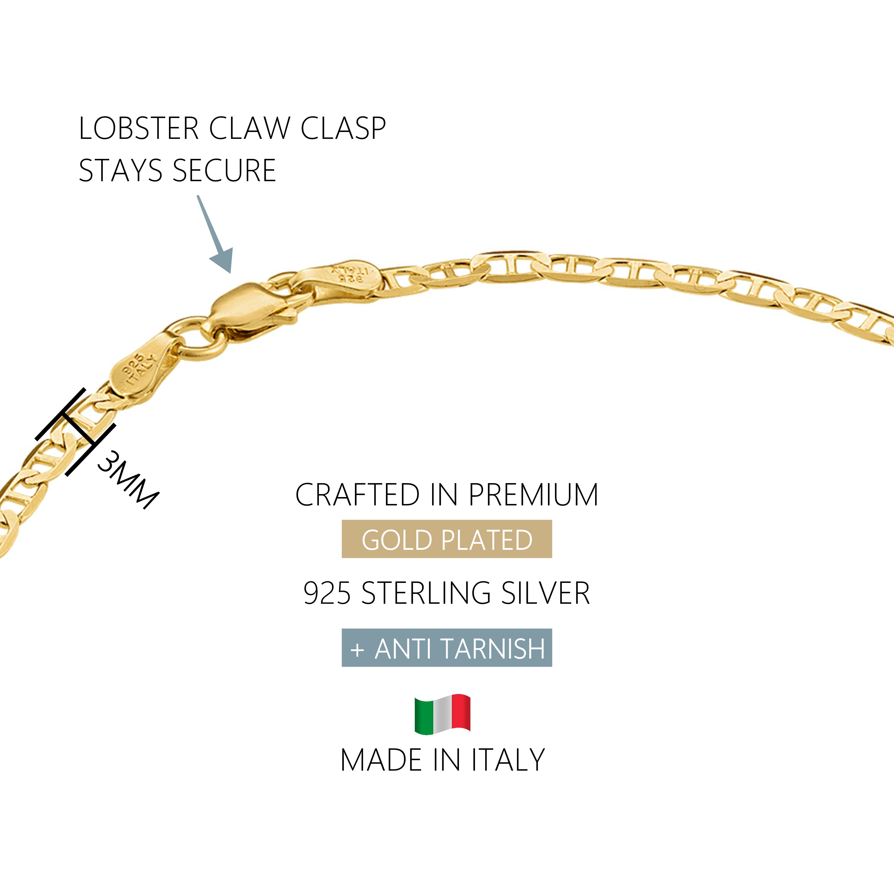 Add a touch of glamour to your everyday outfits with our Kisper 18K Gold Over 925 Sterling Silver Italian Solid Diamond-Cut Flat Mariner Link Chain Anklet. This versatile accessory effortlessly elevates your style, transitioning seamlessly between casual chic and formal flair. Whether paired with your favorite denim, a flowy summer dress, or even barefoot on the beach, this radiant anklet adds a touch of sophistication to any look. Crafted from 92.5% pure sterling silver, nickel-free, and hypoallergenic, it's perfect for sensitive skin. The thick layer of 1 micron 18K yellow gold ensures durability, while the secure lobster-claw clasp offers peace of mind. Made in Italy with superior design excellence and quality craftsmanship, this timeless piece makes the perfect gift for any occasion.