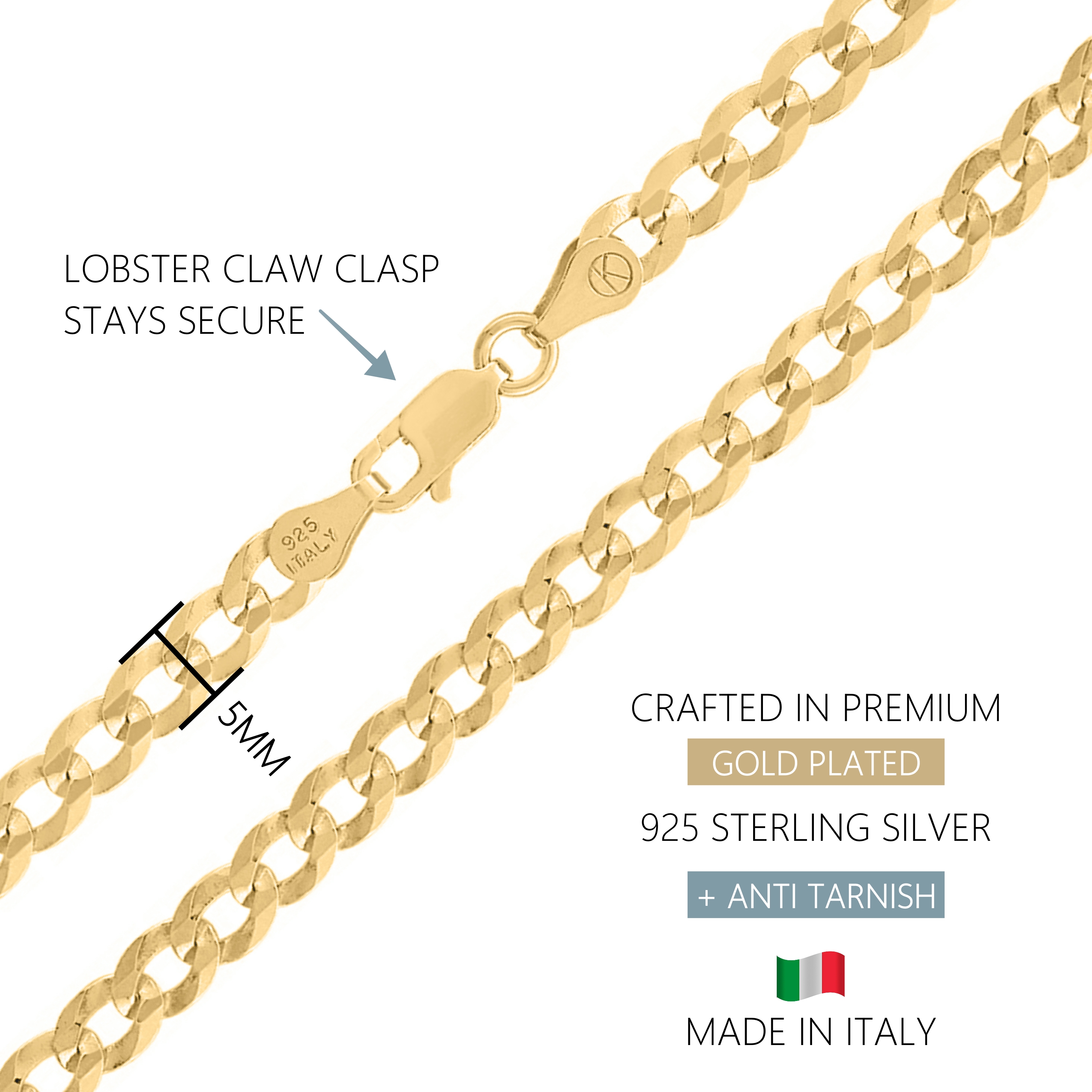 Elevate your fashion statement with the KISPER Italian 18K Gold Over 925 Sterling Silver Diamond Cut 5mm Curb Cuban Link Chain Necklace. This exquisite piece combines modern elegance with timeless charm, featuring flat diamond-cut, beveled links that radiate a reflective, luxurious shine. Crafted in Italy with meticulous attention to detail, this chain boasts durability and style, suitable for daily wear either alone or adorned with your favorite pendant. Made from 92.5% pure sterling silver and plated with a thick layer of 18K yellow gold, it offers hypoallergenic properties, making it ideal for sensitive skin. Complete with a secure lobster-claw clasp and spring mechanism, this necklace ensures both ease of wear and lasting comfort, embodying Italian craftsmanship at its finest.