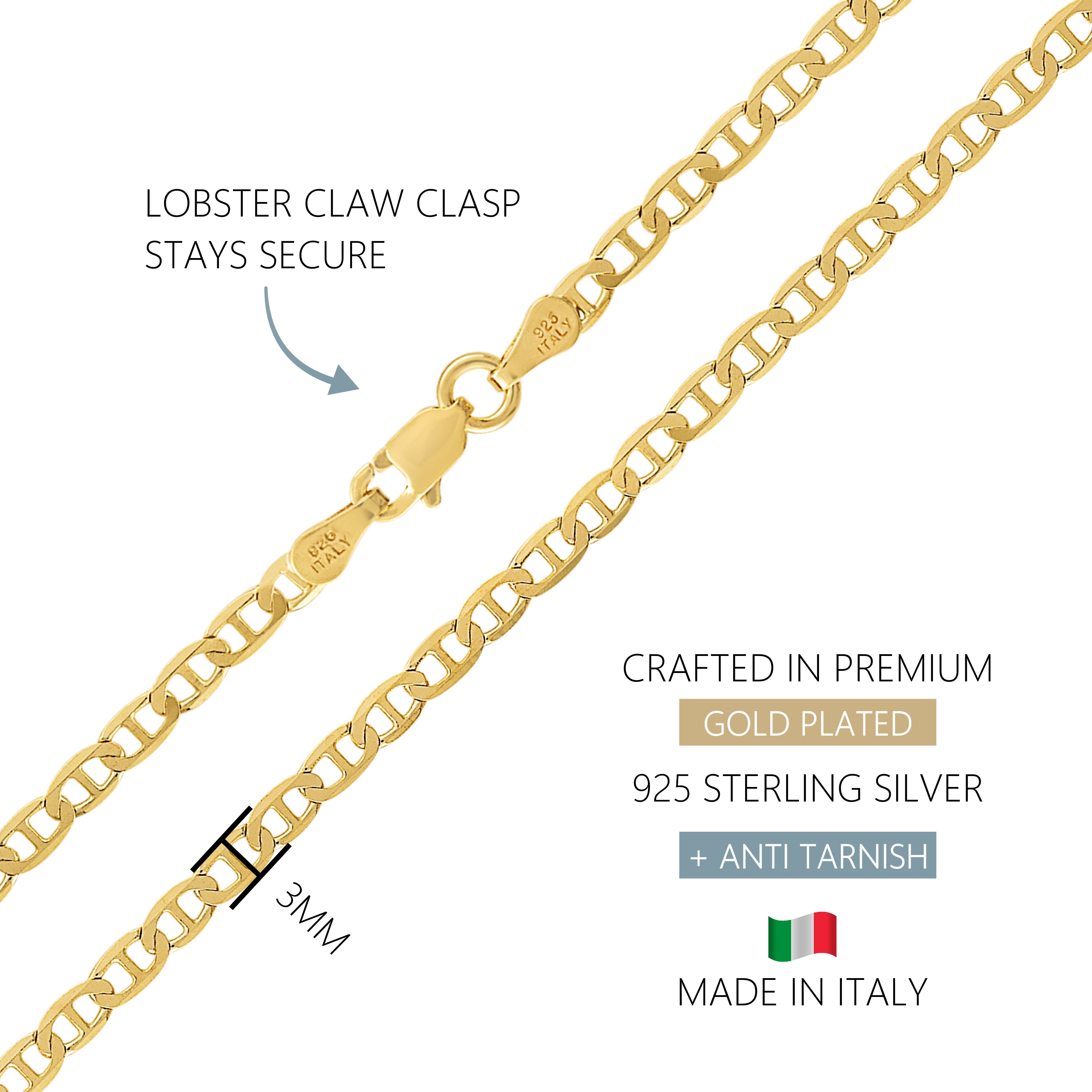 Introduce a touch of elegance to your wardrobe with our Kisper 18K Gold Over 925 Sterling Silver Italian Solid Diamond-Cut Mariner Link Chain Necklace. Featuring flat diamond-cut links, this necklace exudes a rich shine, adding a modern edge to any ensemble. Its slim 3mm design ensures durability and comfort for daily wear, while the secure lobster-claw clasp guarantees peace of mind. Crafted from 92.5% pure sterling silver, nickel-free, and hypoallergenic, it's ideal for sensitive skin. With a thick layer of 1 micron 18K yellow gold for added durability, this necklace is a true testament to luxury. Made in Italy with superior design excellence and quality craftsmanship, it's the perfect gift for any occasion, suitable for both men and women. Every purchase comes with a Kisper jewelry pouch and a lifetime guarantee, ensuring it's ready for gifting and offering comfort for everyday wear.