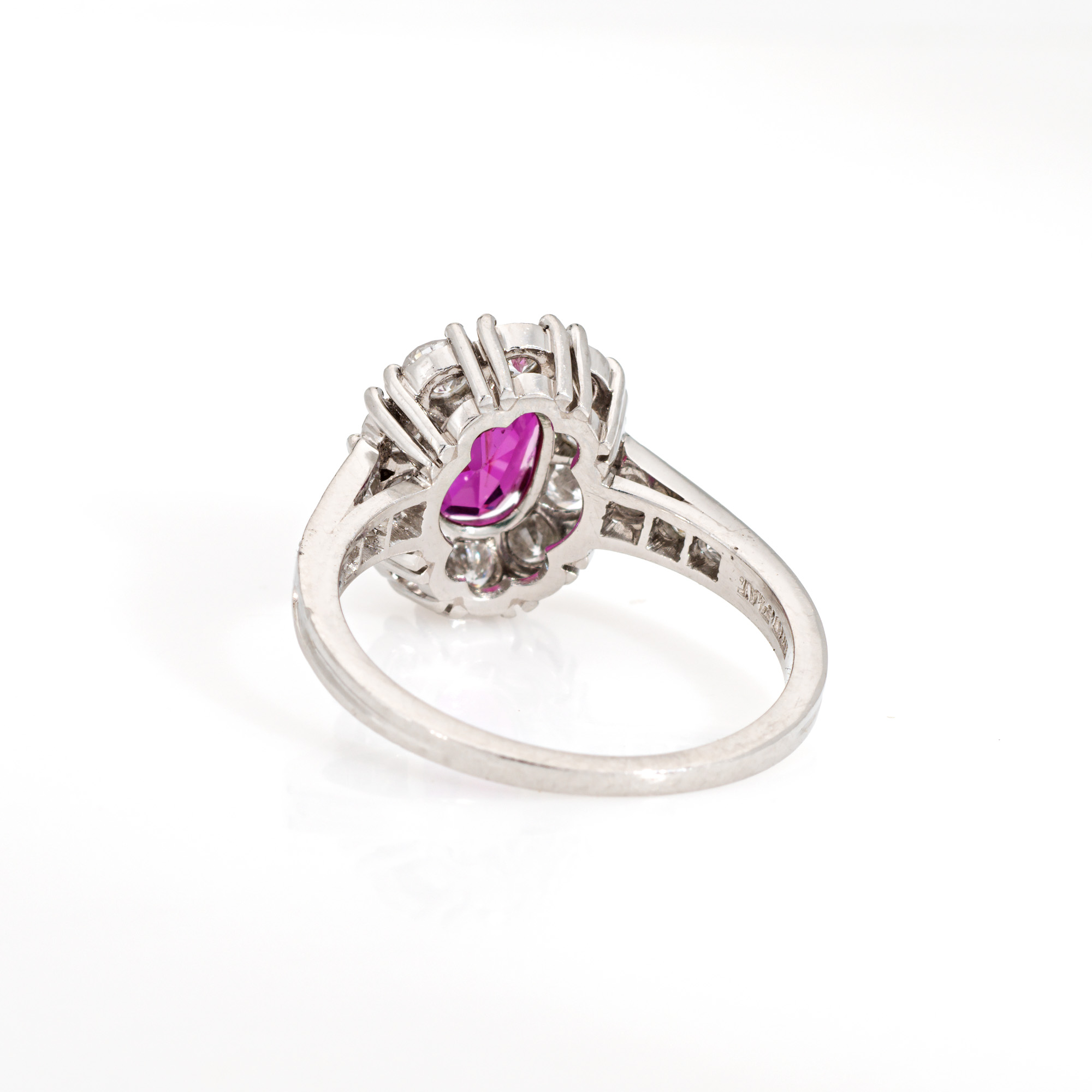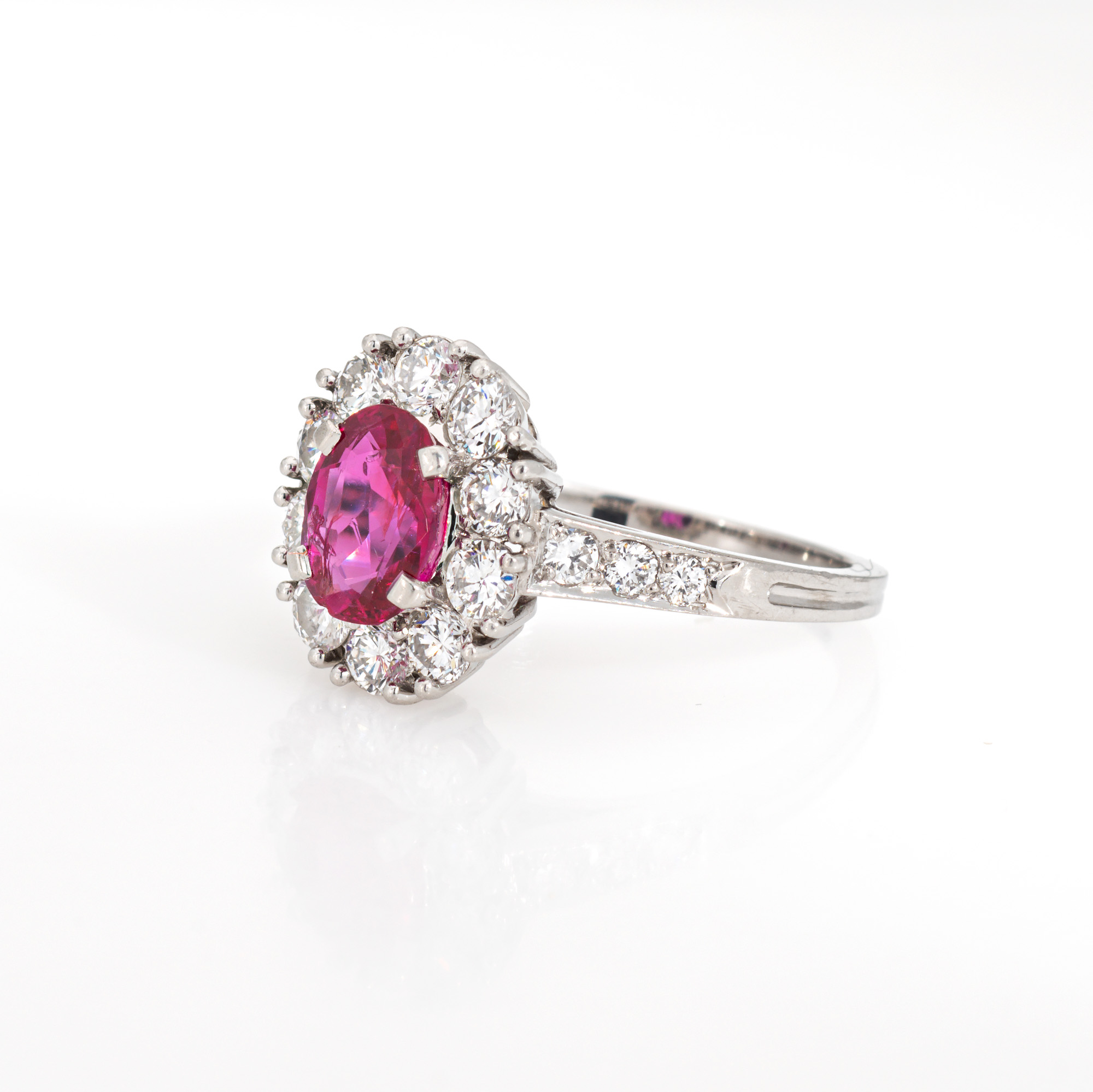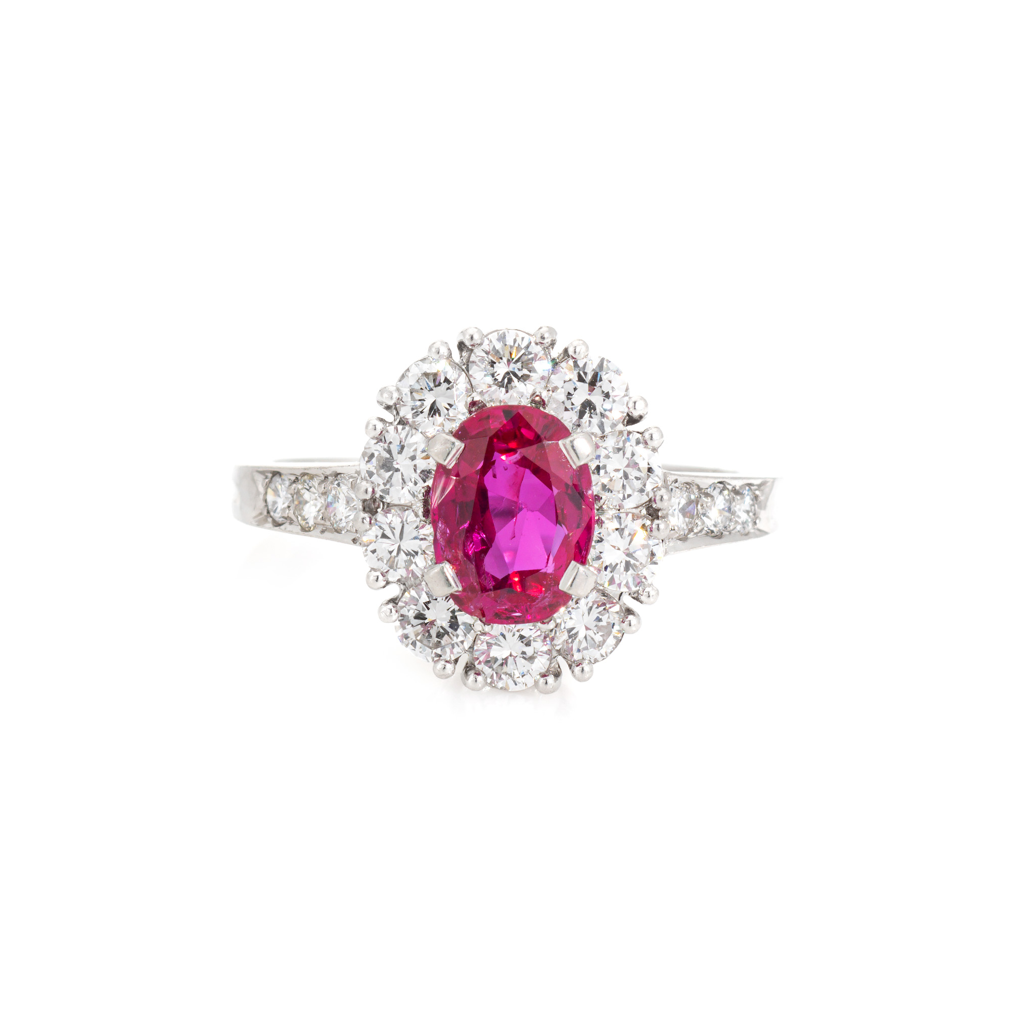 Stones: Oval brilliant cut Ruby measures 7.21 x 5.42 x 3.05mm (estimated at 1 carat). The ruby is natural Corundum and is Burma (Myanmar) in origin. No indication of Heating to the Ruby. Sixteen diamonds total an estimated 0.70 carats (estimated at F-G color and VS clarity). The ruby is in good condition with two tiny chips evident (visible under a 10x loupe).Size & Measurements: The ring is a size 5 1/2 (sizable). The mount measures 12mm in length (0.47 inches) and 10mm wide (0.39 inches), rising 5mm from the finger.