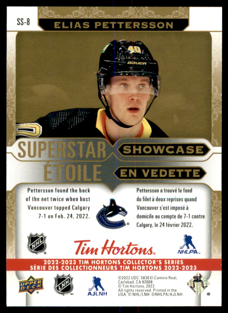 | 2022-23 Upper Deck Tim Hortons Superstar Showcase Elias Pettersson #SS-8 | ||||||||||||||||