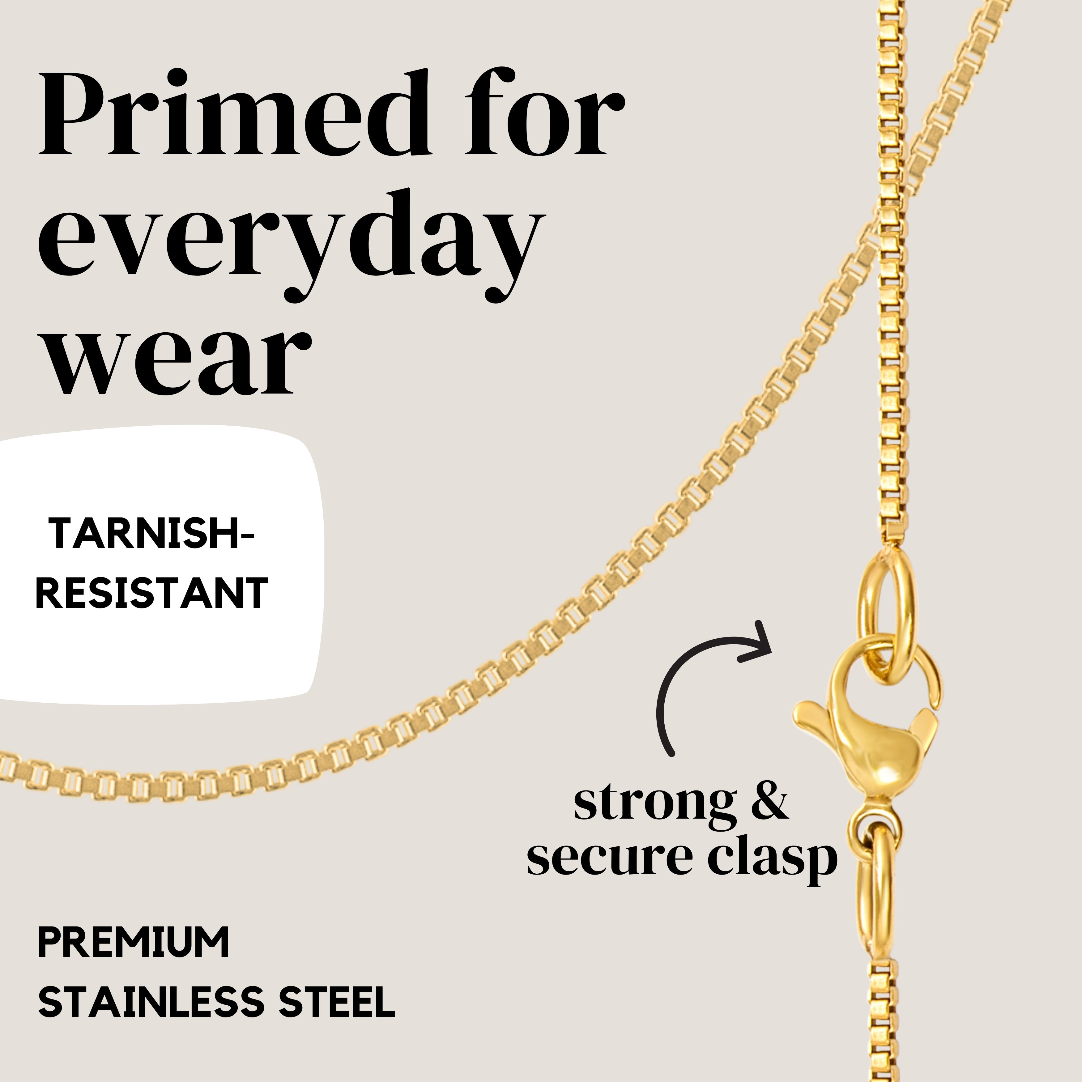 Elevate your style with the KISPER 24k Gold Box Chain Necklace, a stunning piece of gold-plated stainless steel jewelry designed for women. This exquisite 36-inch necklace catches the eye with its sparkling 24k gold finish, adding a touch of luxury to any ensemble. With a versatile 1.2 mm thickness, it can be worn alone or paired with a cherished pendant for any occasion. Hypoallergenic and free from nickel and lead, this real gold necklace offers both style and comfort. Available in 10 sizes ranging from 14 to 36 inches, it's perfect for layering and guaranteed to bring enduring sophistication and joy, backed by KISPER's lifetime promise.