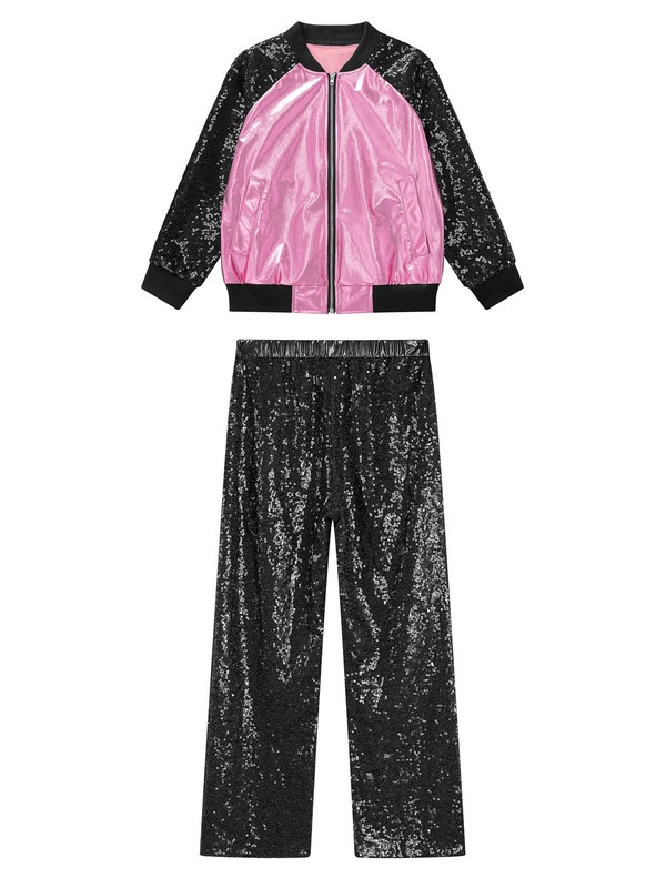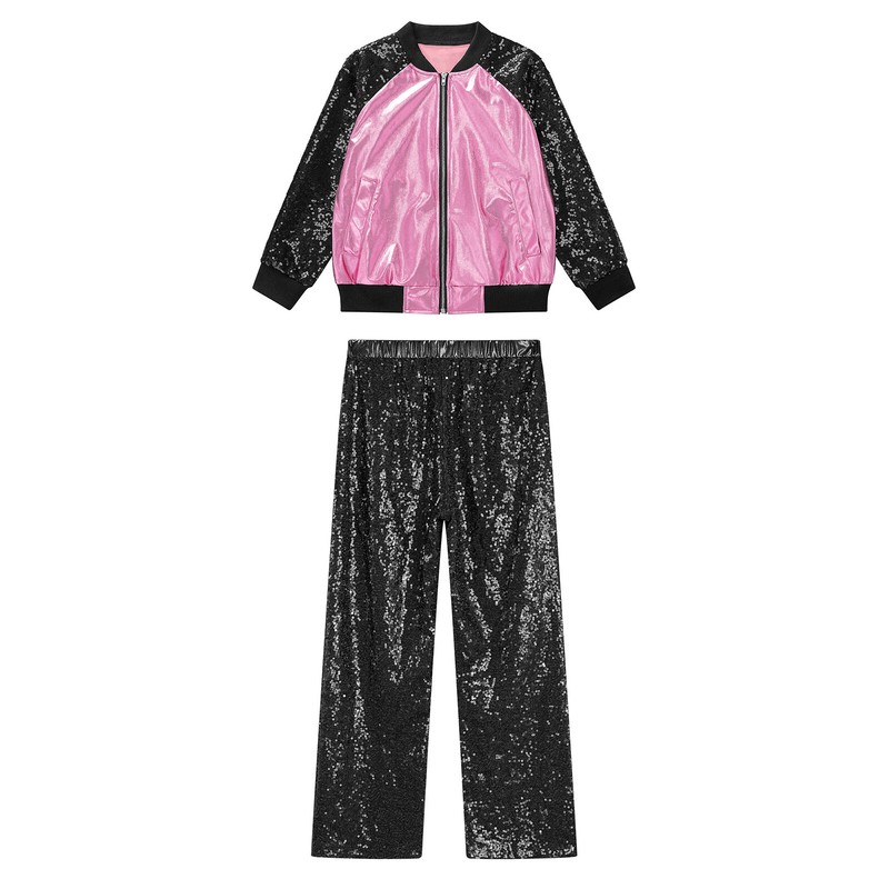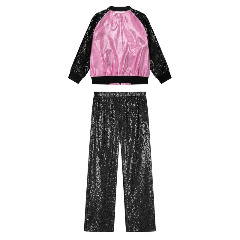 Stand collar jacket for girls, patchwork design, sequins long sleeves, ribbed cuffs and hem, front zipper closure for easy wearing.