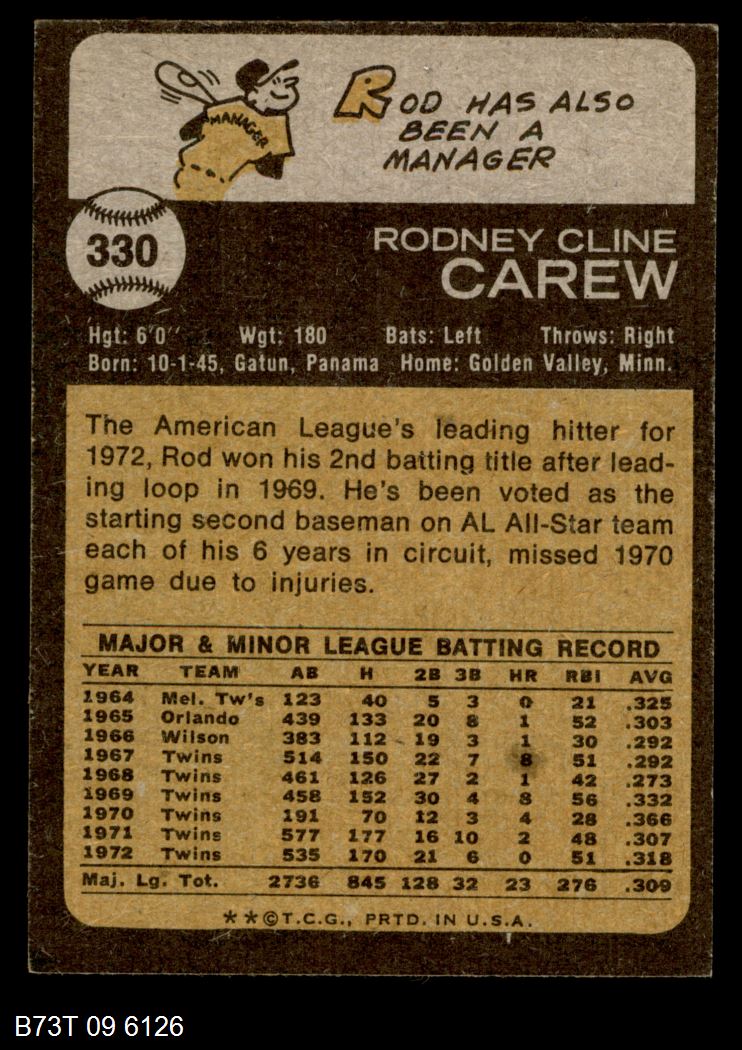 | 1973 Topps #330 Rod Carew | 5 - EX | Front | Back |