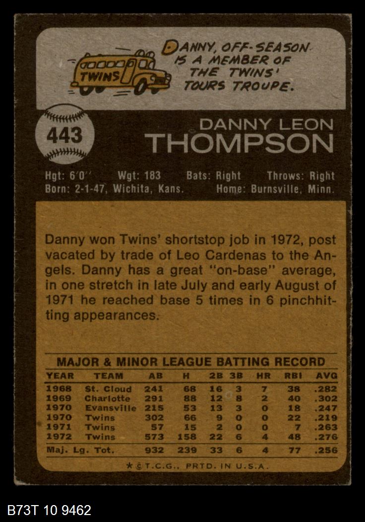 | 1973 Topps #443 Danny Thompson | 4 - VG/EX | Front | Back |