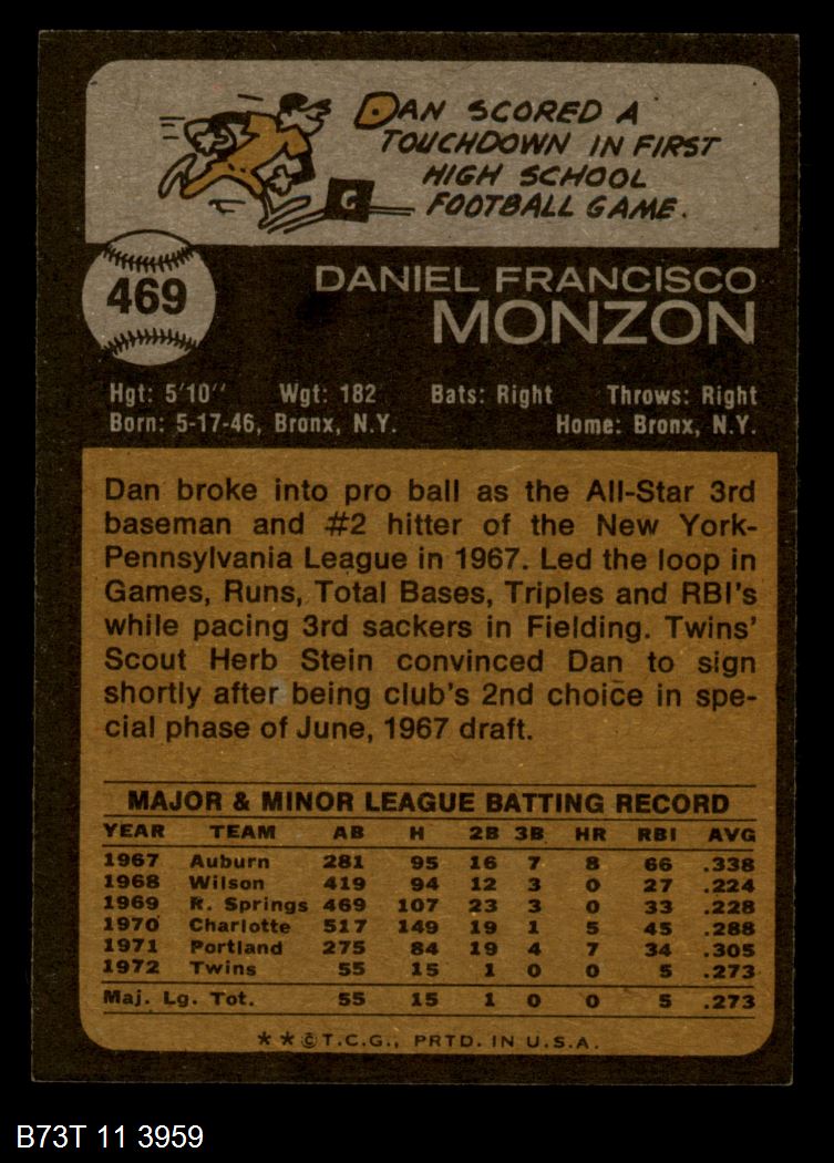 | 1973 Topps #469 Dan Monzon | 4 - VG/EX | Front | Back |