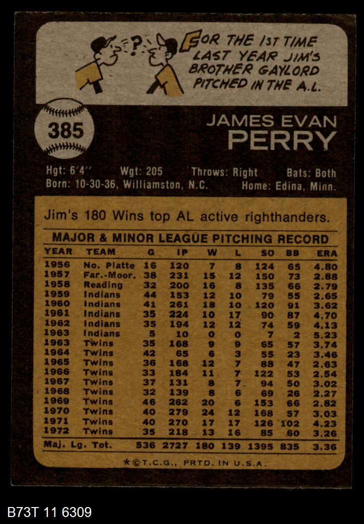 | 1973 Topps #385 Jim Perry | 4 - VG/EX | Front | Back |