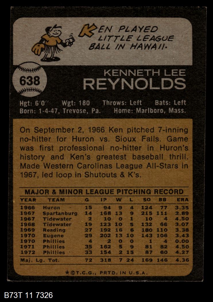 | 1973 Topps #638 Ken Reynolds | 3 - VG | Front | Back |