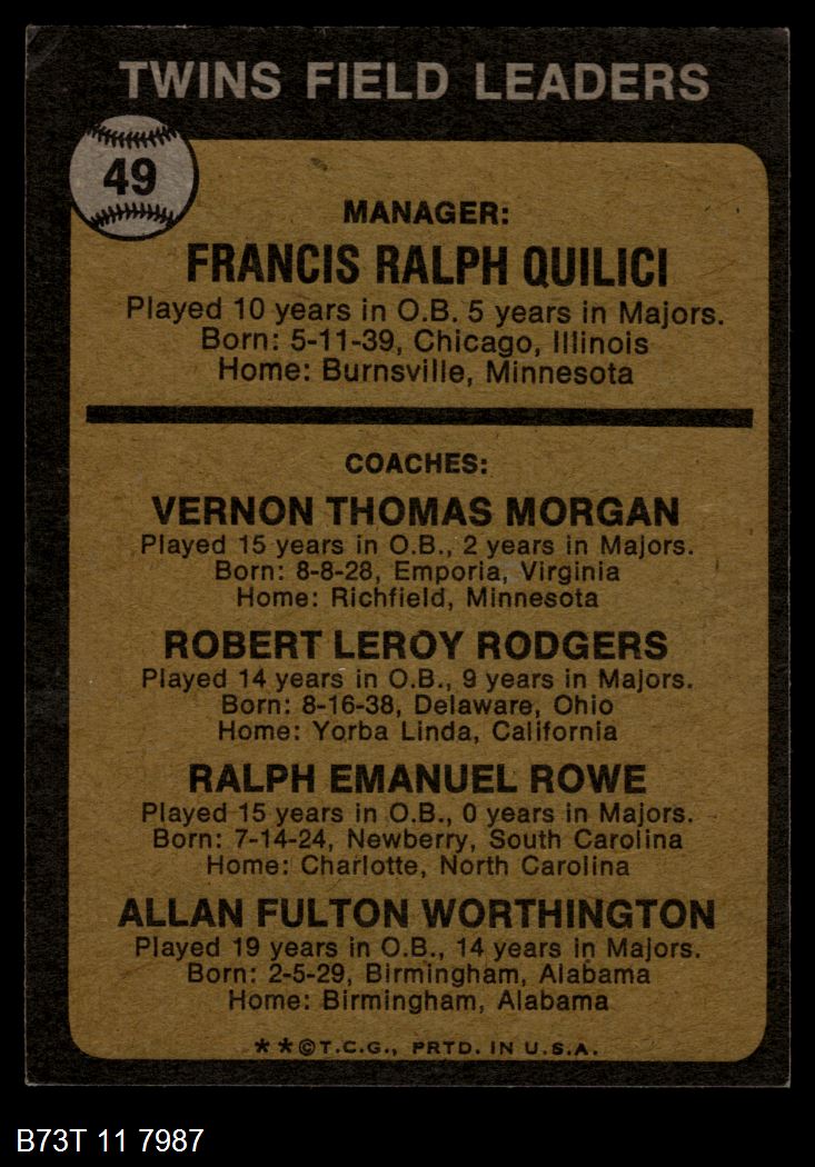 | 1973 Topps #49 BRN - Frank Quilici / Vern Morgan / Bob Rodgers / Ralph Rowe / Al Worthington Twins Leaders | 3 - VG | Front | Back |