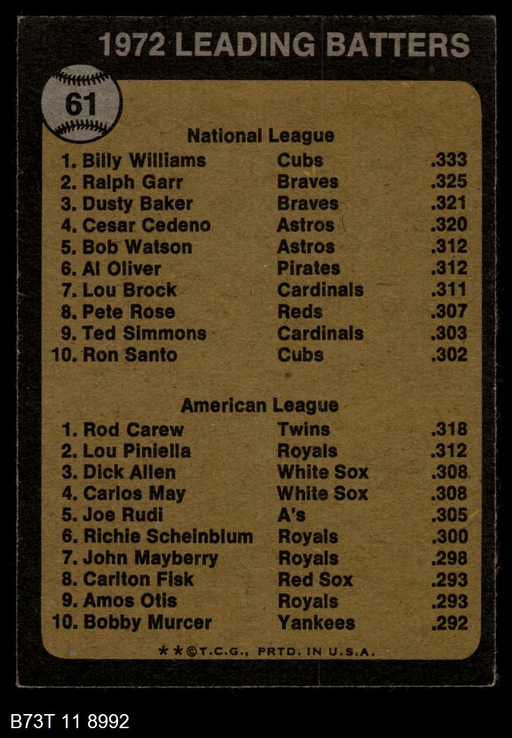 | 1973 Topps #61 - Billy Williams / Rod Carew Batting Leaders | 4 - VG/EX | Front | Back |