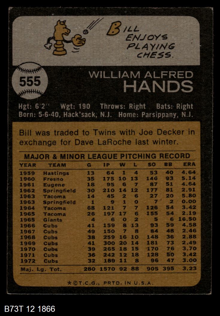 | 1973 Topps #555 Bill Hands | 3 - VG | Front | Back |
