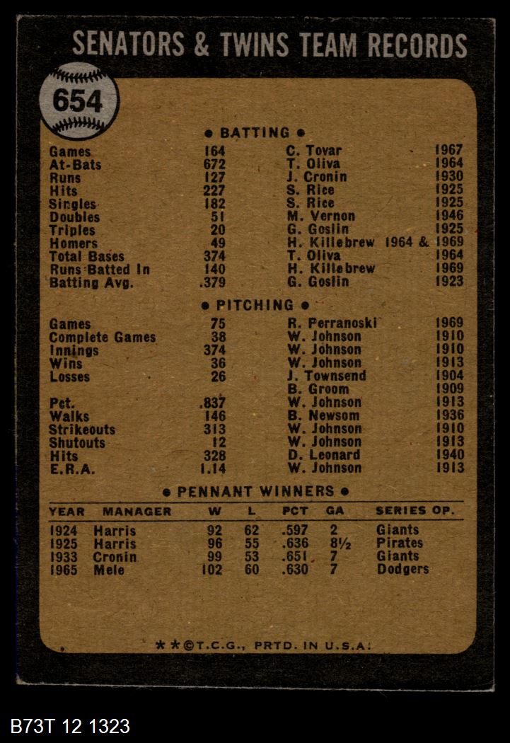 | 1973 Topps #654 Twins Team | 3 - VG | Front | Back |