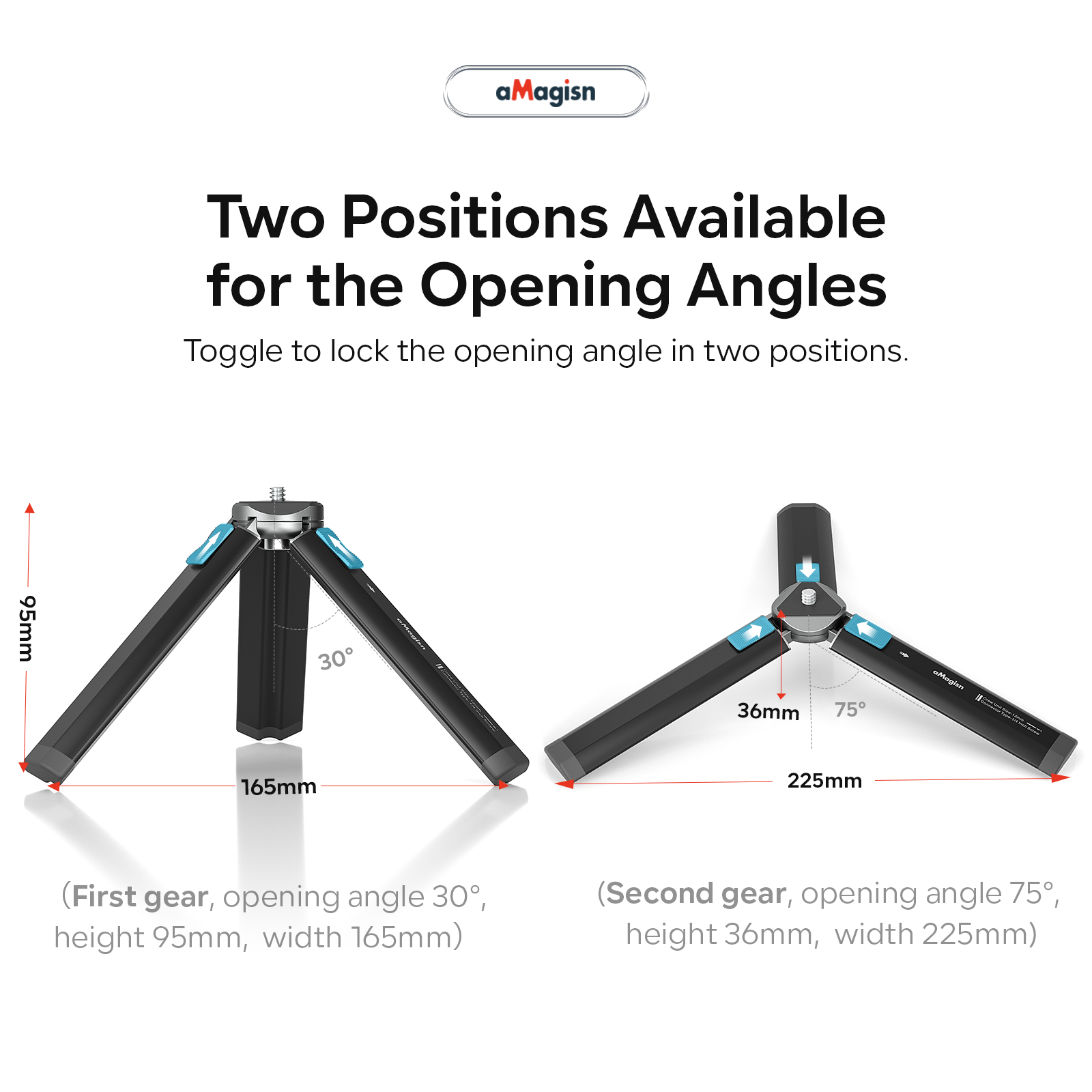 The tripod has 2 gears, toggle the button to lock the 2 gears open angle.