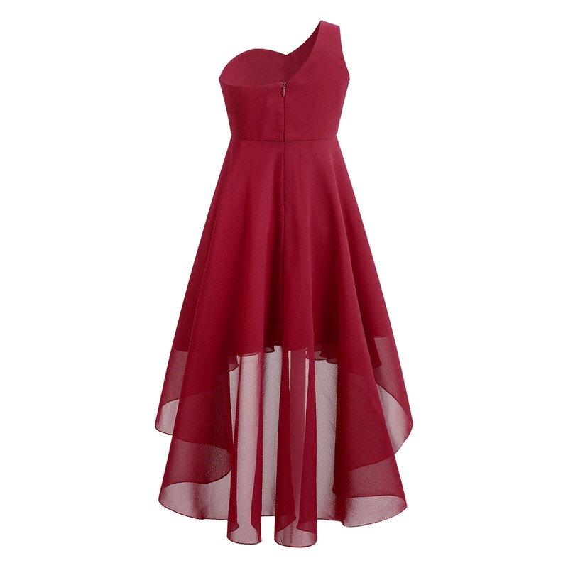 Featuring with one shoulder, sweetheart, high-low chiffon hem, smooth lining and back zipper closure.