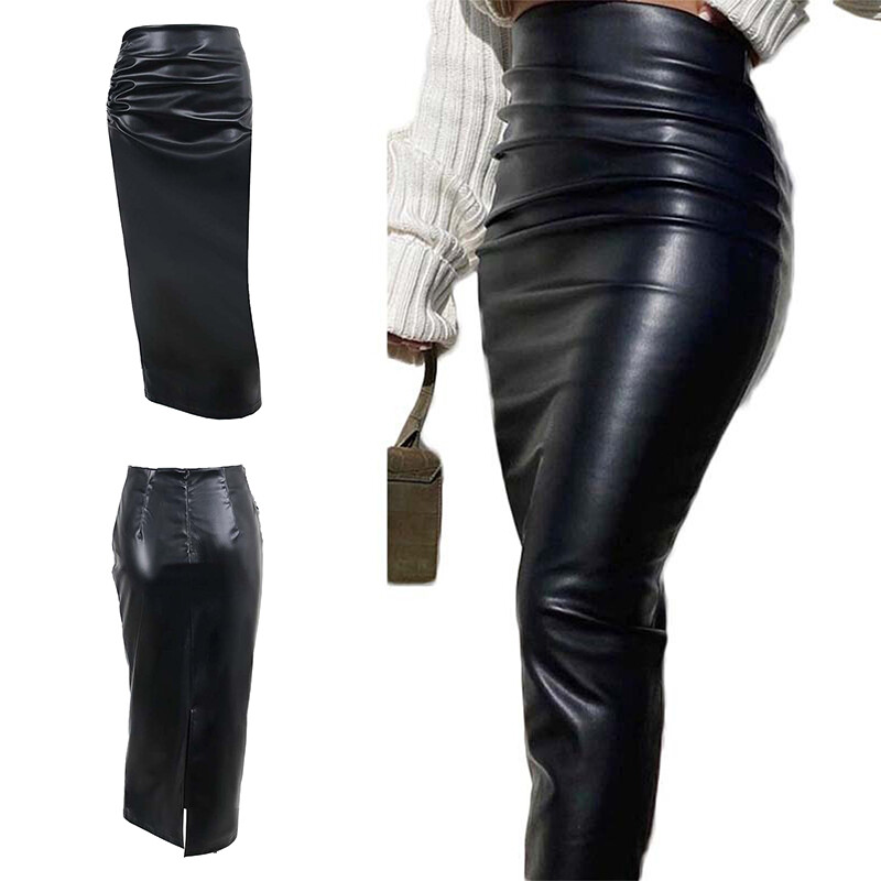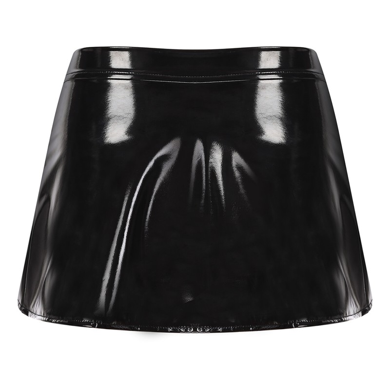 Glossy patent leather skirt for women, open front design, one press button closure, mini length.