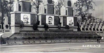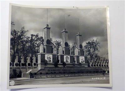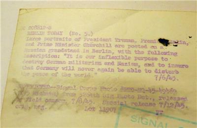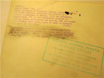 Offered for auction is a remarkable vintage Signal Corps publicity photo dating back to 1945. This captivating photo measures 10" by 8" and features large portraits of three iconic world leaders: Harry S. Truman, Joseph Stalin, and Winston Churchill, prominently displayed in Berlin.