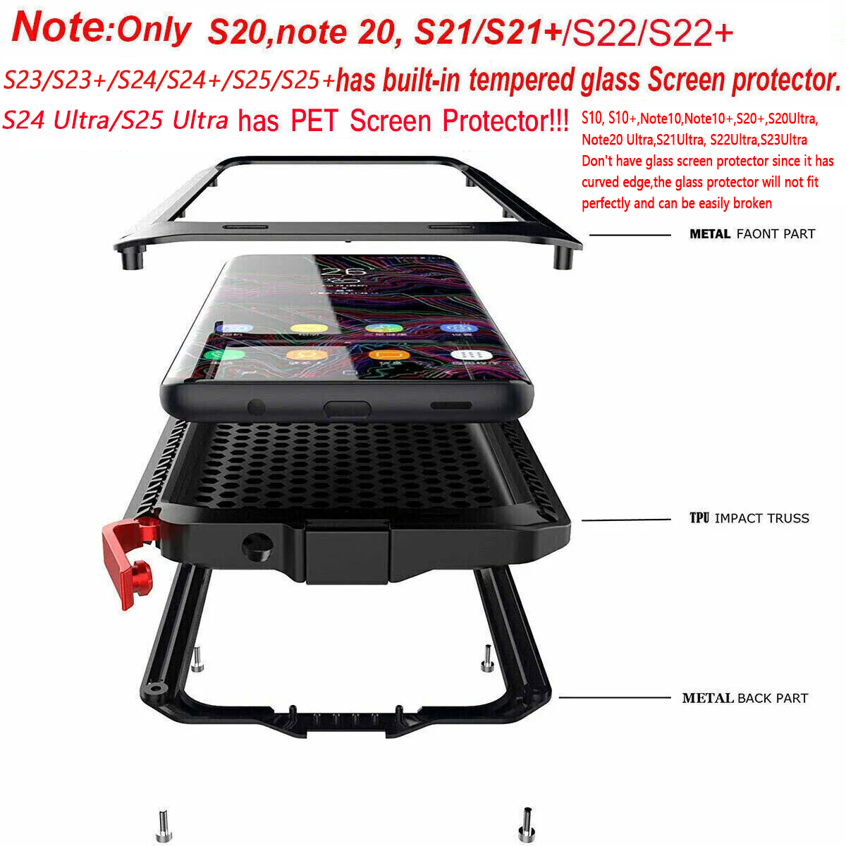 Note: only the S20, NOTE 20, S21 , S21+,S22,S22+,s23,s23+ ,S24,S24+, S25, S25+ case has the tempered glass,