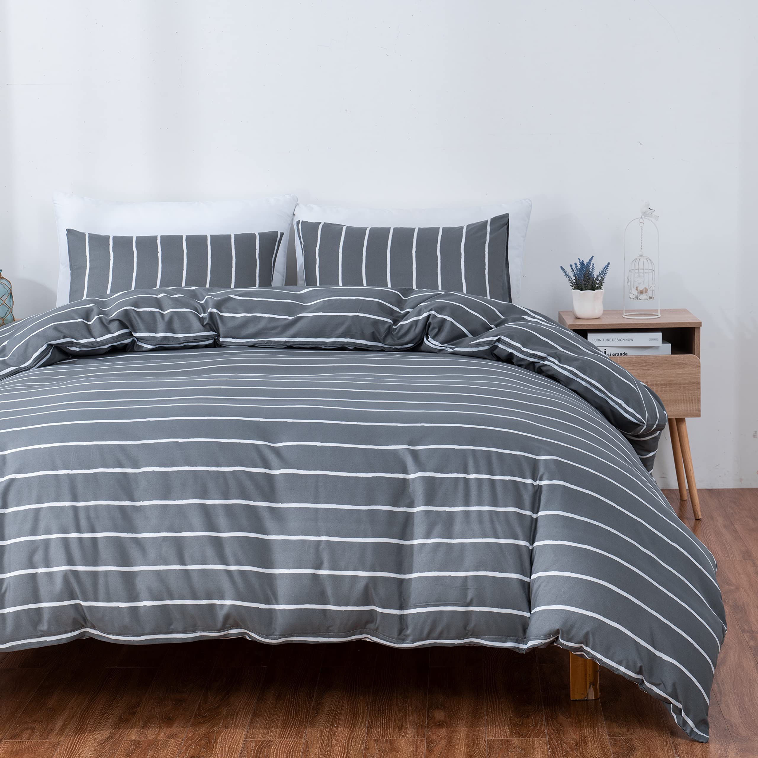100% Microfiber Duvet Cover Set Includes:Queen Comforter Cover Set 1 x Duvet cover (without comforter) 2 x Pillow cases Environmentally friendly dyeing,the fabric is soft breathable and lightweight. Size Information Twin Duvet Cover Set(2 Pieces bedding set) - 1 x duvet cover:68" x 90", 1 x pillow case:20" x 26". Full/Queen Duvet Cover Set(3 Pieces bedding set) - 1 x duvet cover:90" x 90", 2 x pillow cases:20" x 26". King Duvet Cover Set(3 Pieces) - 1 x duvet cover:104" x 90", 2 x pillow cases:20" x 36". Gray Comforter Cover Set Design Gray and white striped duvet cover set,striped bedding,gray and white striped comforter set,geometry element pattern print,designers carefully design pattern,suit for any season,home duvet cover set or hotel duvet cover set,application widely,for kids,teens, boys, girls, men or women.Also can as gift,send to your friends. Corner ties, to keep your duvet insert in place; Zipper closure, convenient to get the duvet in and out. Bedding Set Easy Care Machine wash in cold water, gentle cycle, tumble dry at low heat, do not bleach.when washing a duvet cover with a zipper, close the zipper completely to prevent snags and tears during laundering. *Please note: comforter or duvet insert is not included.