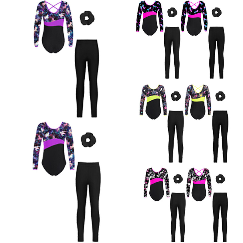 Kids Girls One-piece Long Sleeves Stars Print Ballet Dance Leotard Bodysuit.