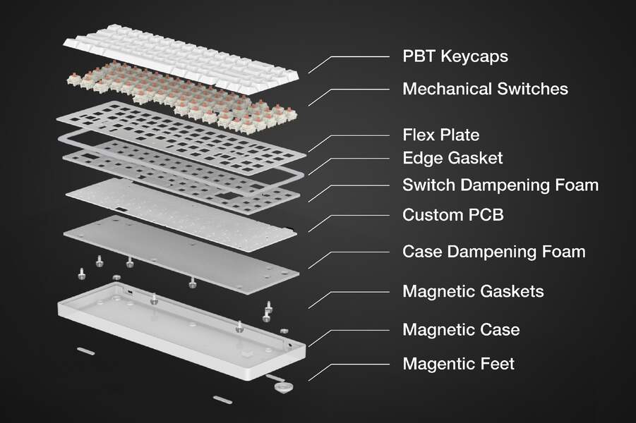 Tired of the hassle that comes with adjusting your keyboard's sound and tactility, or simply cleaning it? The WhiteFox Eclipse eliminates the need for tools with its magnetic gasket-mounted design. Easily open, customize, and clean your keyboard, no matter where you are. No tools, no trouble. Just lift up and get to work.