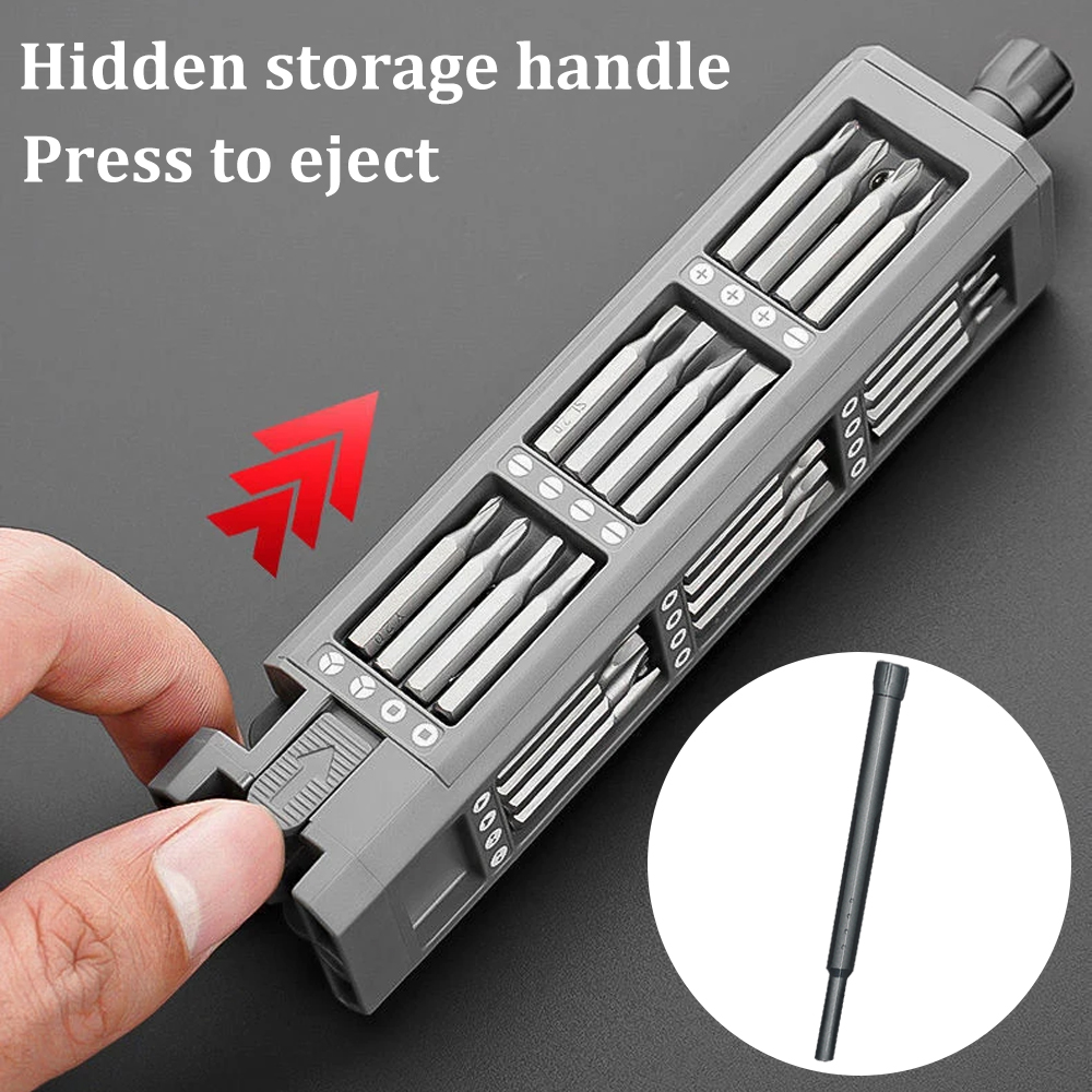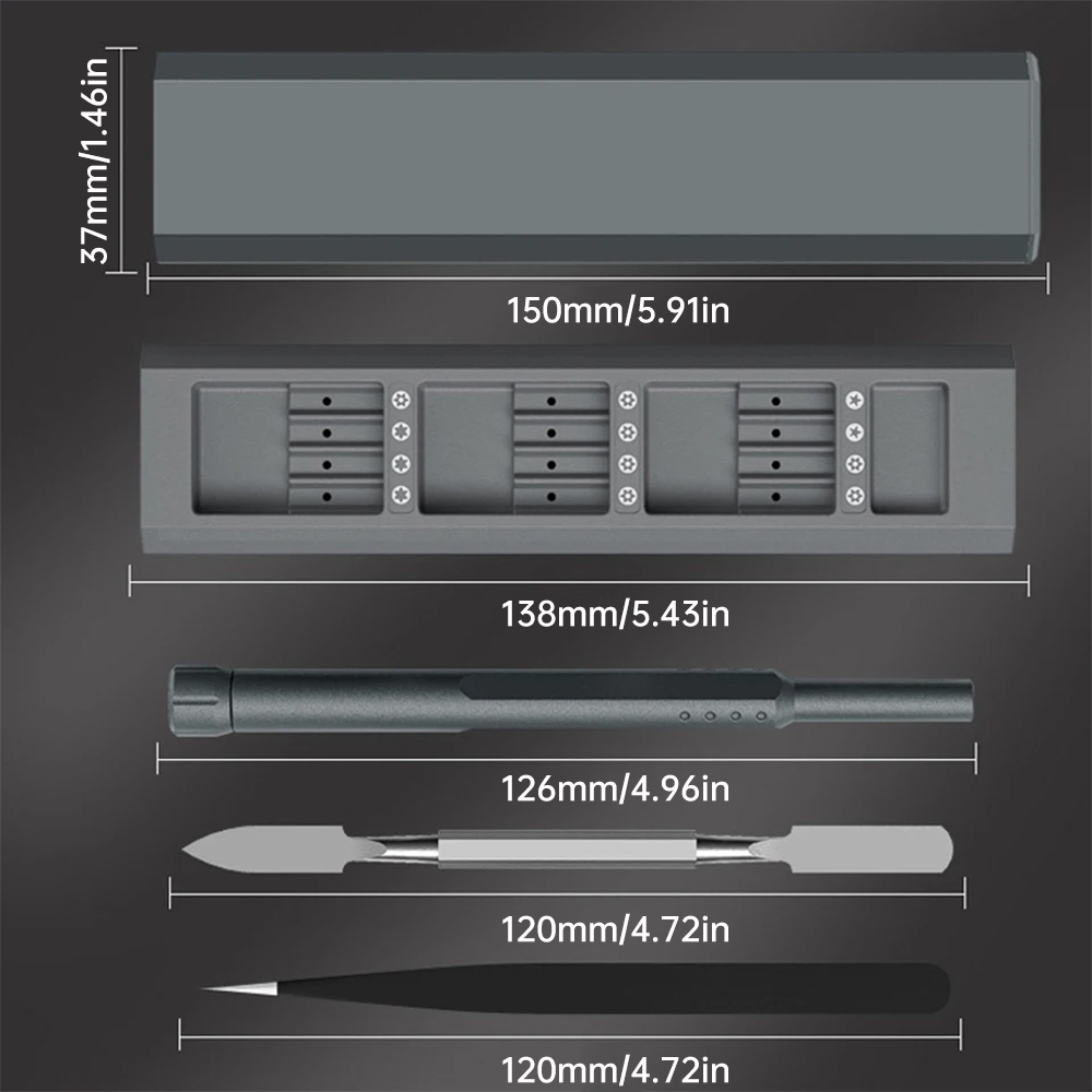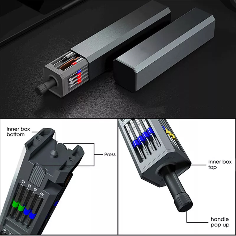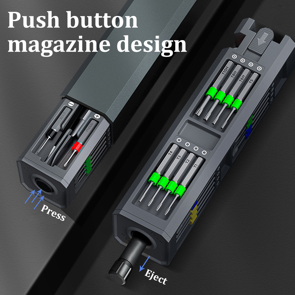 5. The durable aluminum shell is anodized, not easy to rust, and can be easily placed in a tool bag or pocket. The storage bin has a built-in eject button for easy removal and locking. The magnetic box helps to hold all the screws in place so they don't fall off. Material: S2 Alloy Steel.