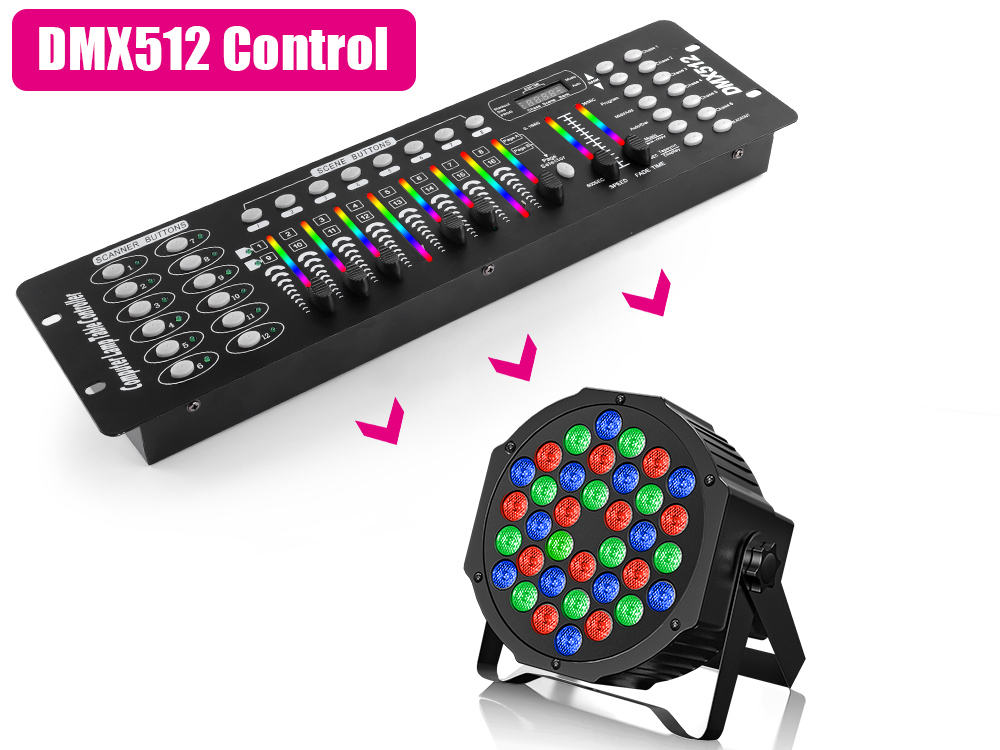 3. Multiple control modes. This product is controlled by DMX512 / sound / master-slave / automatic mode, you can change the color, dimming, strobe, sound activation.