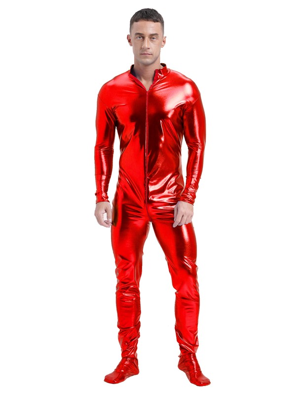 Men’s bodysuit designs with mock neck, long sleeve, full-body covering, metallic shiny surface, front zipper from neck to crotch.