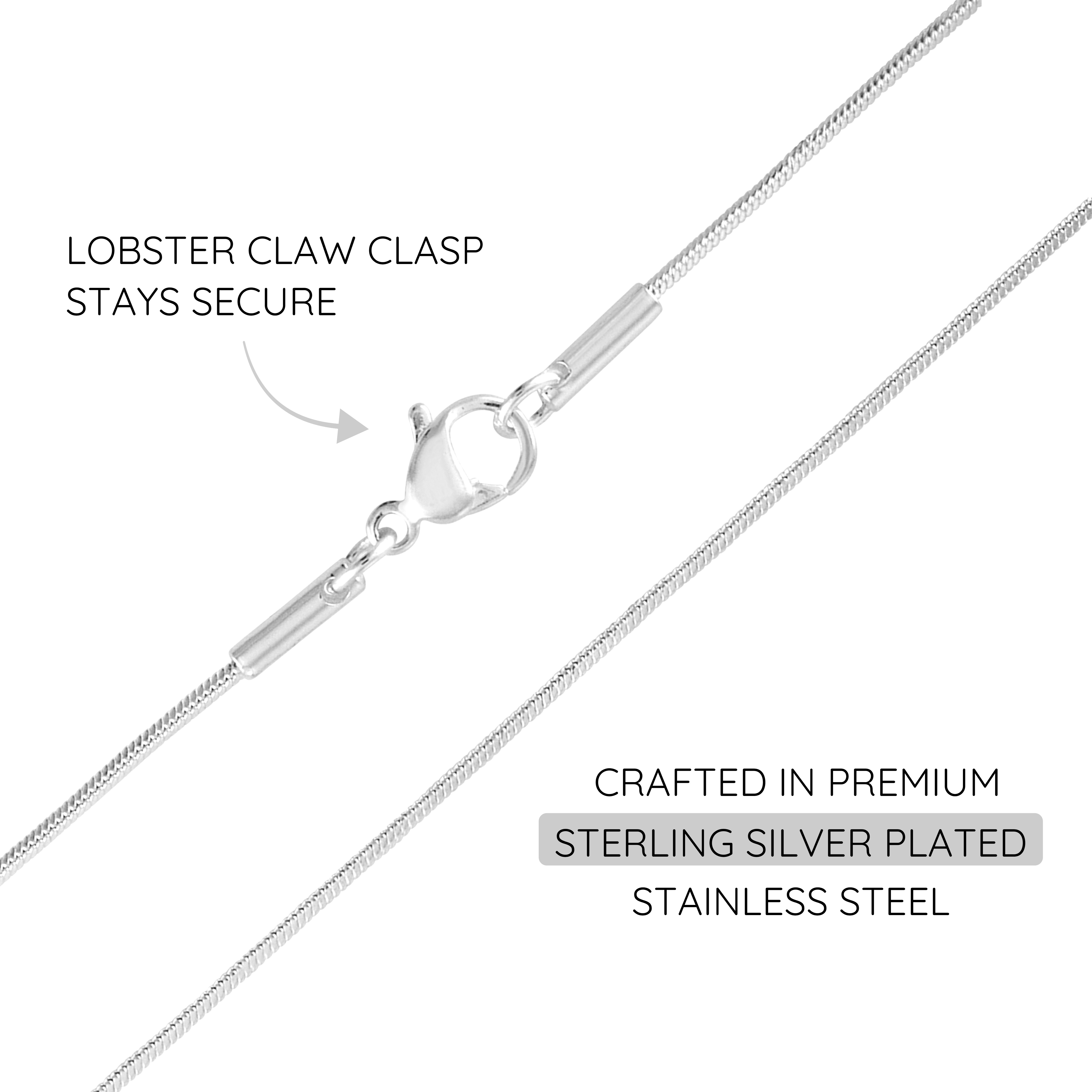 Elevate your style with the KISPER Sterling Silver Snake Chain Necklace, a thin and delicate piece suitable for both men and women. Crafted from sterling silver-plated stainless steel, this 1mm thick necklace offers a sparkling finish that catches the eye effortlessly. Its versatility makes it perfect for any setting - whether worn alone or paired with a cherished pendant, it adds a touch of sophistication to any outfit or occasion. Hypoallergenic and nickel-free, this necklace ensures comfort and style without compromise. With a range of sizes available from 14 inches to 30 inches, you can select the perfect length for your preference, ideal for layering or standalone wear. Designed in the U.S. and backed by KISPER's lifetime guarantee, this sterling silver and stainless steel chain promises enduring joy and sophistication, becoming a timeless staple in your collection.