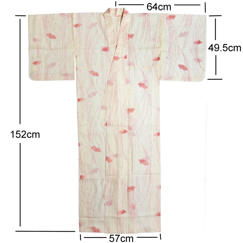 This is a lovely summer semi-transparent Ro Kimono in a Yanagi-branch print. Note that we are unsure of the fabric however it seems to be Ro Silk and have factored this uncertainty into the asking price. It has possibly been worn but is in excellent condition. We were able to find one minor yellowish age spot and another bluish, ink-like stain on the left sleeve - neither is very noticeable. It is completely hand-sewn with excellent tailoring. This type of kimono is worn in the hot summer months in Japan. It is semi-transparent so requires a white Juban undergarment.