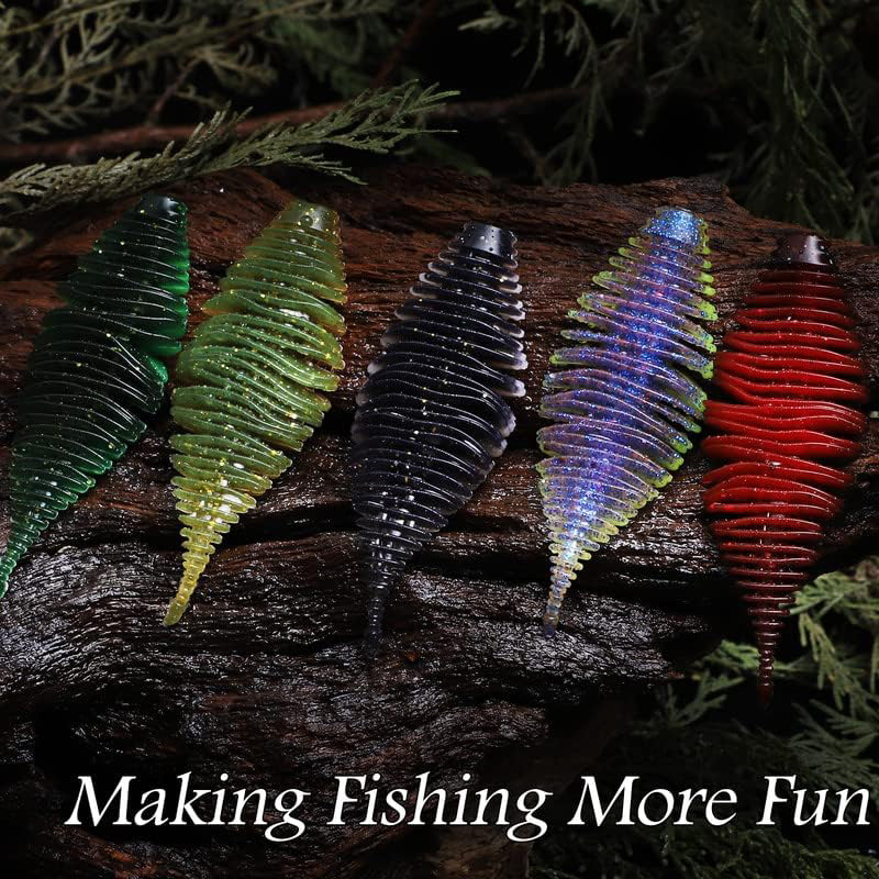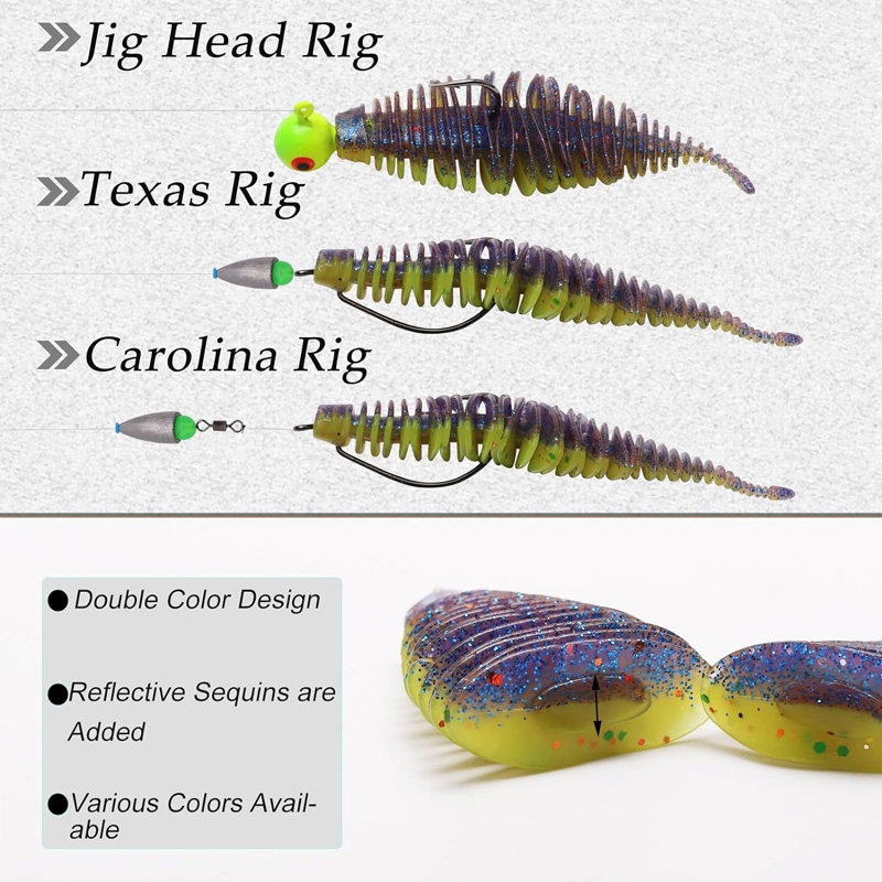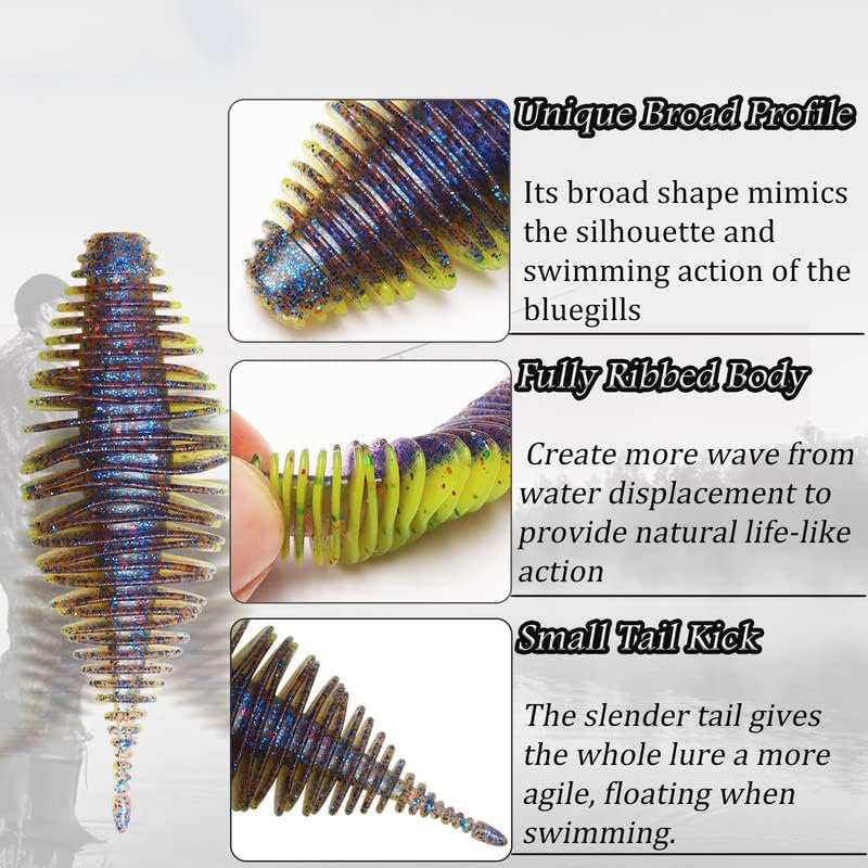 【Fully Ribbed Body】: Soft body is ribbed from head to tail and the ribs give the bait a natural feel once the fish grab on. They move more water and create more waves from water displacement and provide natural life-like action. The slender tail gives the whole lure a more agile, floating when swimming.