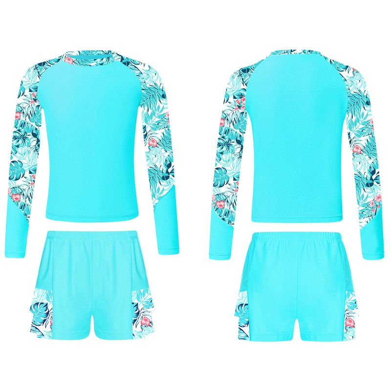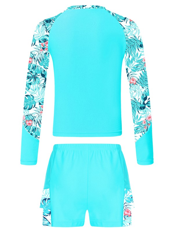 Mock neck long sleeve swim top, vibrant print at neck and sleeves make girls look lively and beautiful.