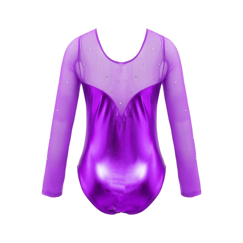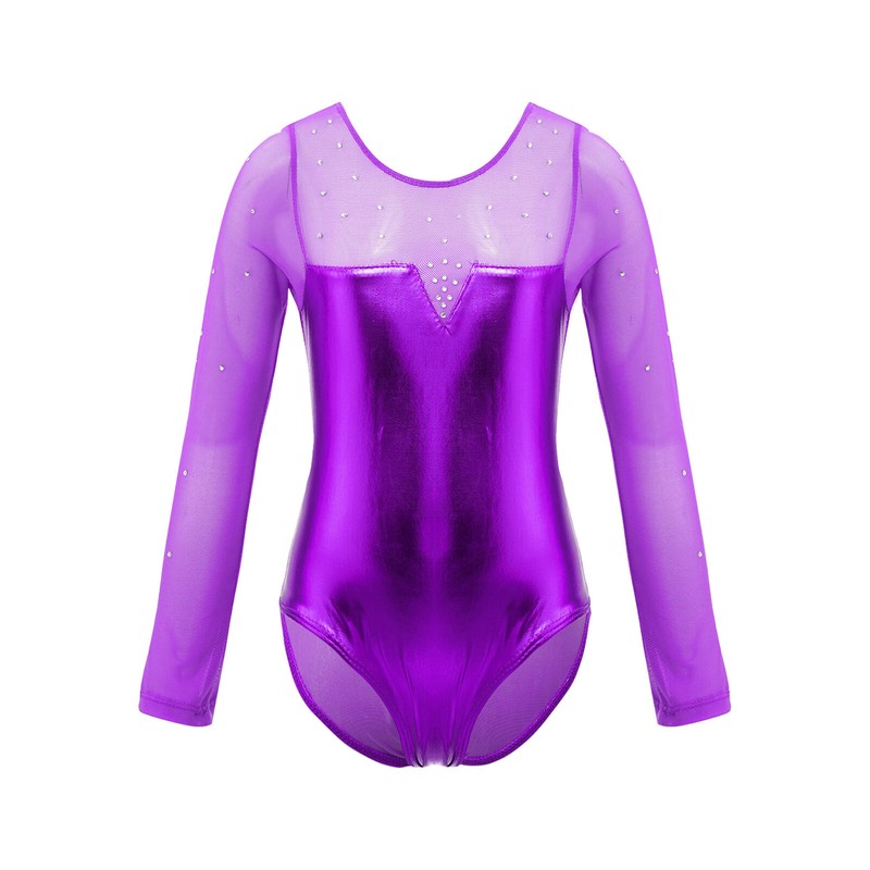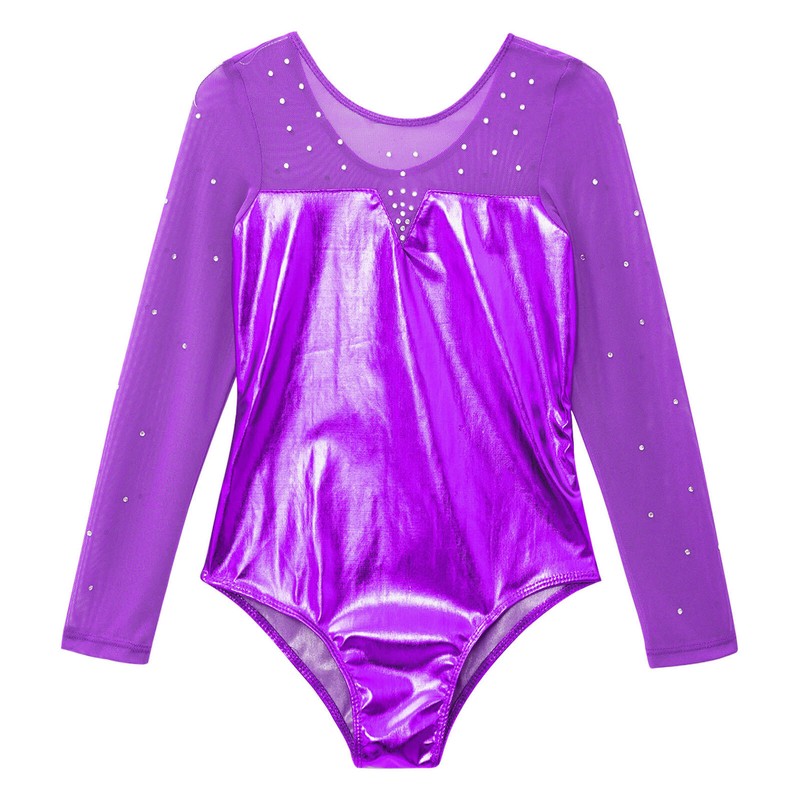 Long sleeve metallic leotard is embellished with sparkling rhinestones, patchwork design.