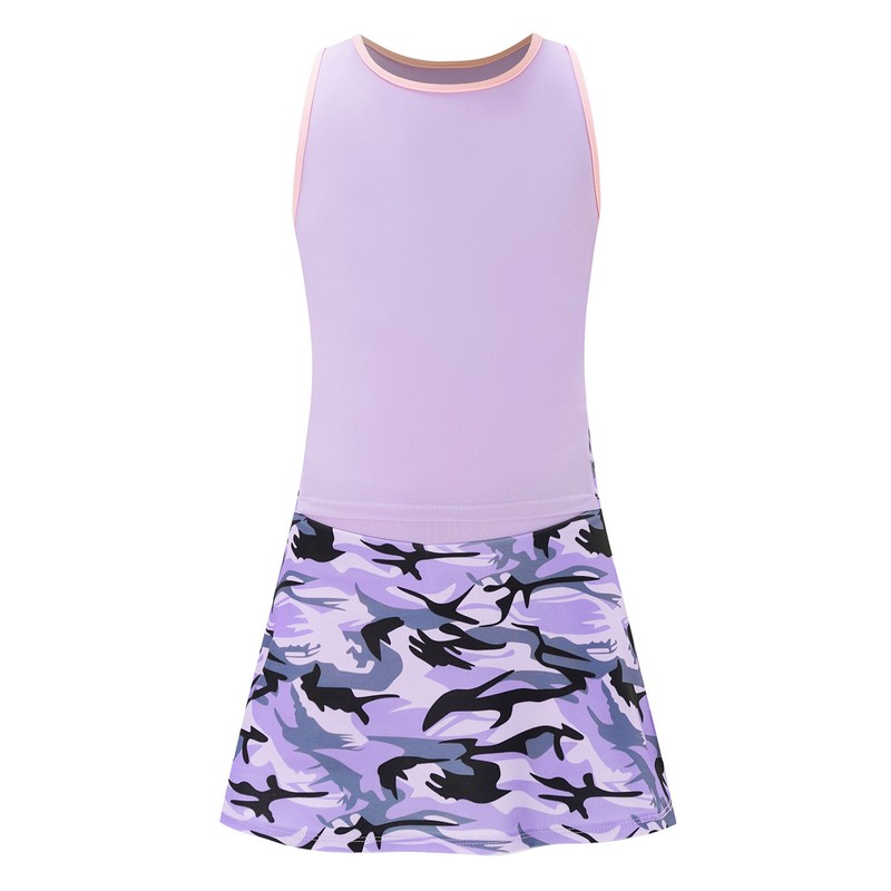 Match with round neck sleeveless vest and printed skirt, above knee length skirt with built-in shorts.