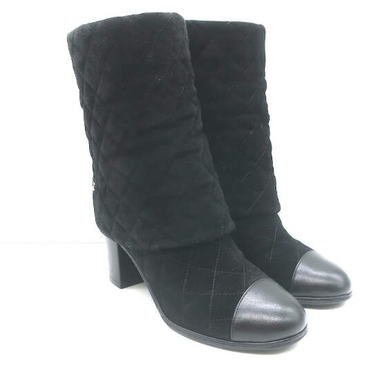 Step into luxury with these elegant pre-owned Chanel boots in black suede. Crafted with meticulous attention to detail, these Chanel 17B Clover & Heart Quilted Fold-Over Boots exude sophistication. Featuring a unique clover and heart quilted design, these boots in size 35.5 are a rare find.