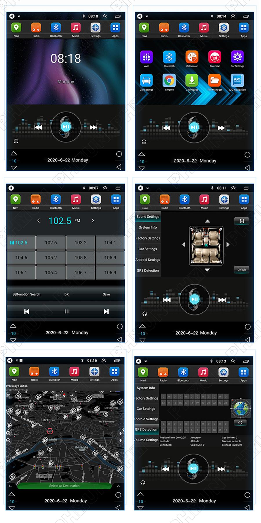 Setup | - WiFi/Hotspot/Bluetooth: Yes - Brightness level adjustable: Yes - Wallpaper: Wallpapers/Live Wallpapers/Gallery - Sound: Key Tone & Volume - Storage: Display Internal Storage/Nand Flash/Connected Device Storage - Apps: Running Apps display/force stop/uninstall - Security: Yes - Accounts: Yes - Languages and Input: more than 70 Languages and choose input method - Backup and Reset: Yes - Date and Time: Setting Date&Time by yourself or choose GPS/network-provided time - Accessibility: Yes - GPS: Yes, GPS application options/monitoring/sound mode/mixing ratio - Driving safety: Watching Video, Reversing X-mirror/Volume, Reversing Trajectory/radar Display, Rear view ruler - Amplifier: Rock/Pop/Jazz/Classic/Flat/Voice/Custom - Steering Wheel Control: Yes - About Device: Display Parameter Info. |