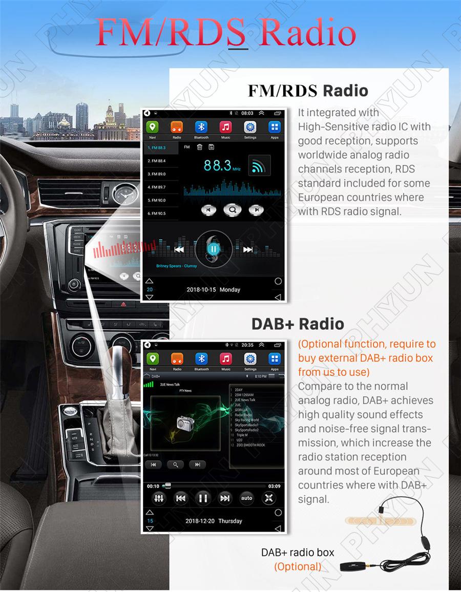 Radio | - FM Tuning Range: 87.5-108MHz - FM Increment: 0.05MHz(EU)/0.1MHz(US) - FM Area: Europe/USA1/USA2/Japan/Russia - Preset Stations: 30(FM 3*6) - RDS:ON/OFF |