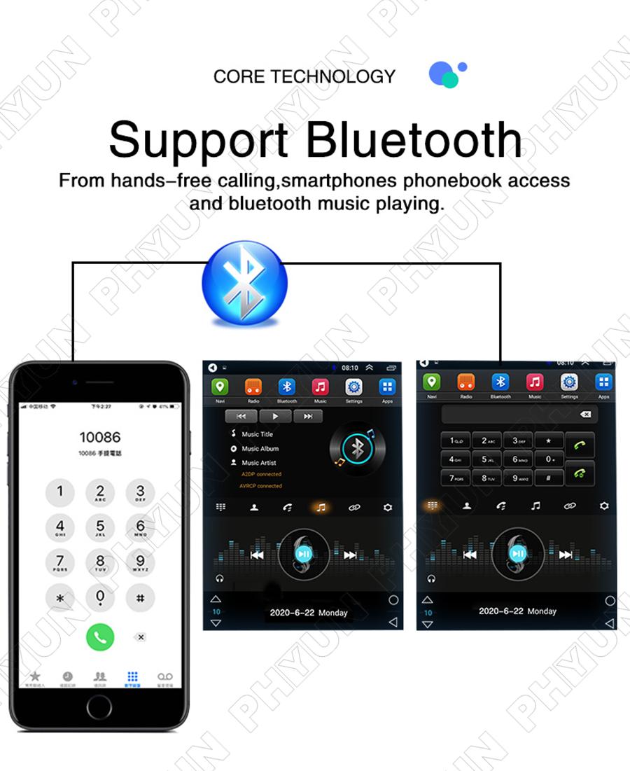 Bluetooth | - Hands Free: Yes - A2DP (Bluetooth Stereo Music): Yes, can play stereo music through Bluetooth - Bluetooth Music Control: Yes, play/pause/previous/next - PB-Download: Yes, can download phonebook from mobile to this unit - PB-Search: Yes, can use the first letter to search contact member in PB-Listings - Calling Records: Yes, Dialed Call, Received Call, Missed Call - Setup: Auto Answer, Auto connect, Device name - Built-in Microphone: Yes, on the front panel - External Microphone Jack:Yes on the RCA cable |