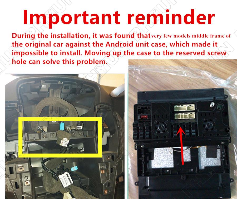 | Notice | During the installation, it was found that some cars's orignal middle frame against the Android unit case, which made it impossible to install. Moving up the case to the reserved screw hole can solve this problem. |