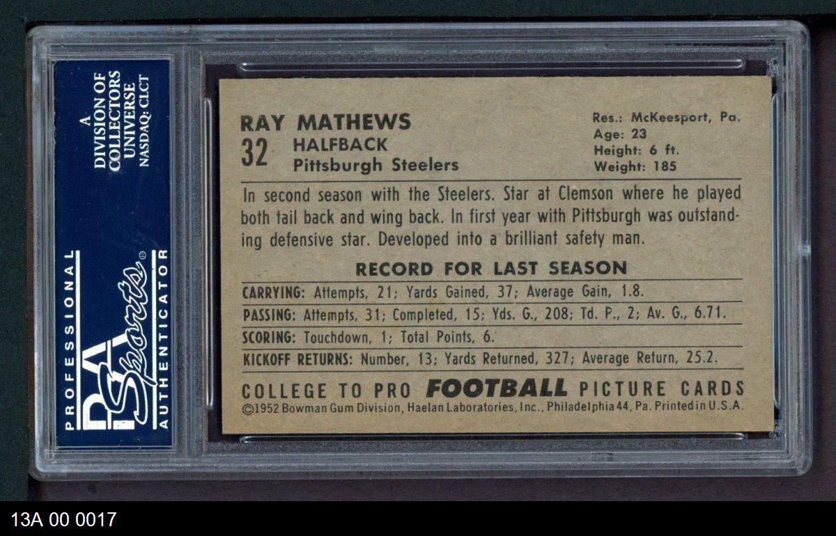 | 1952 Bowman Large #32 Ray Mathews | PSA 7 - NM | Front | Back |
